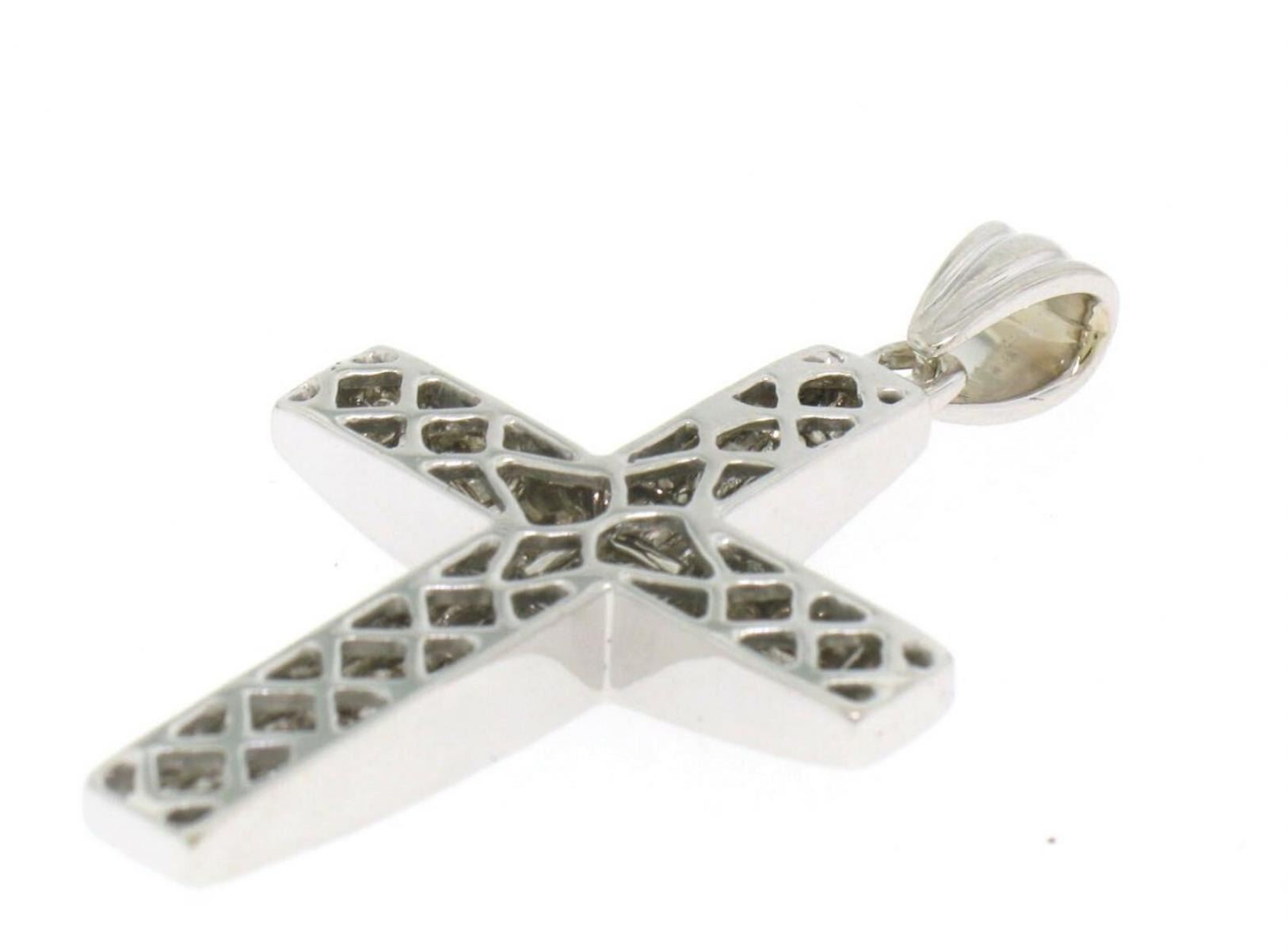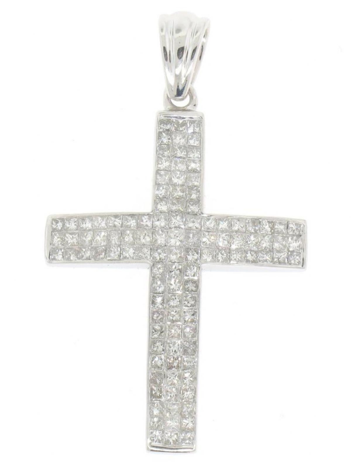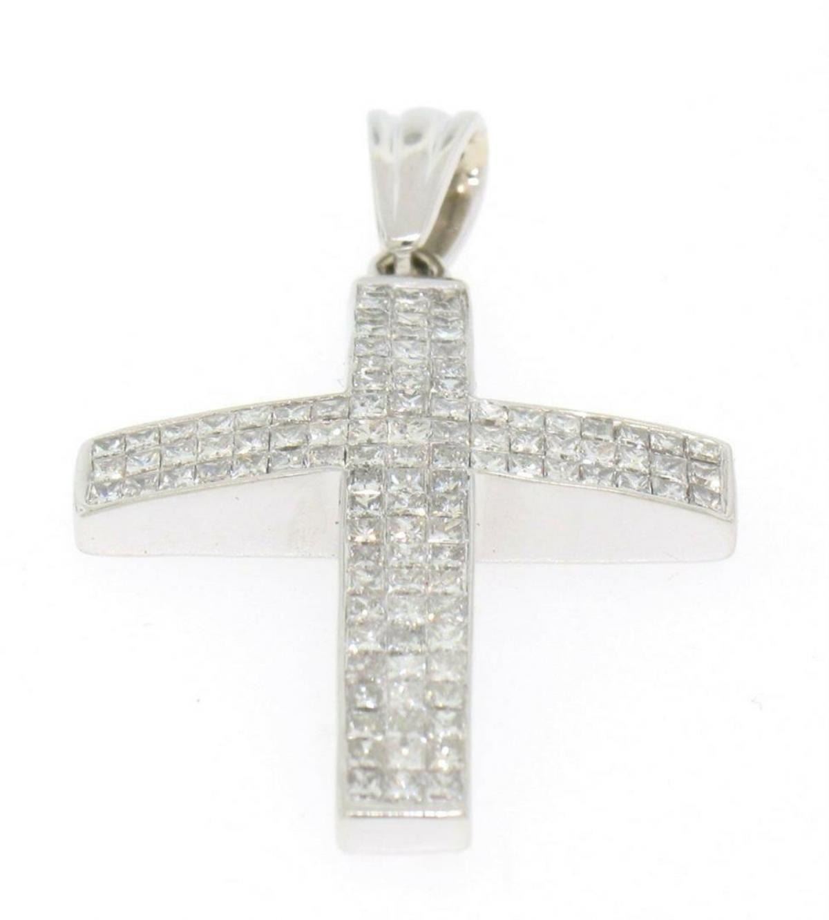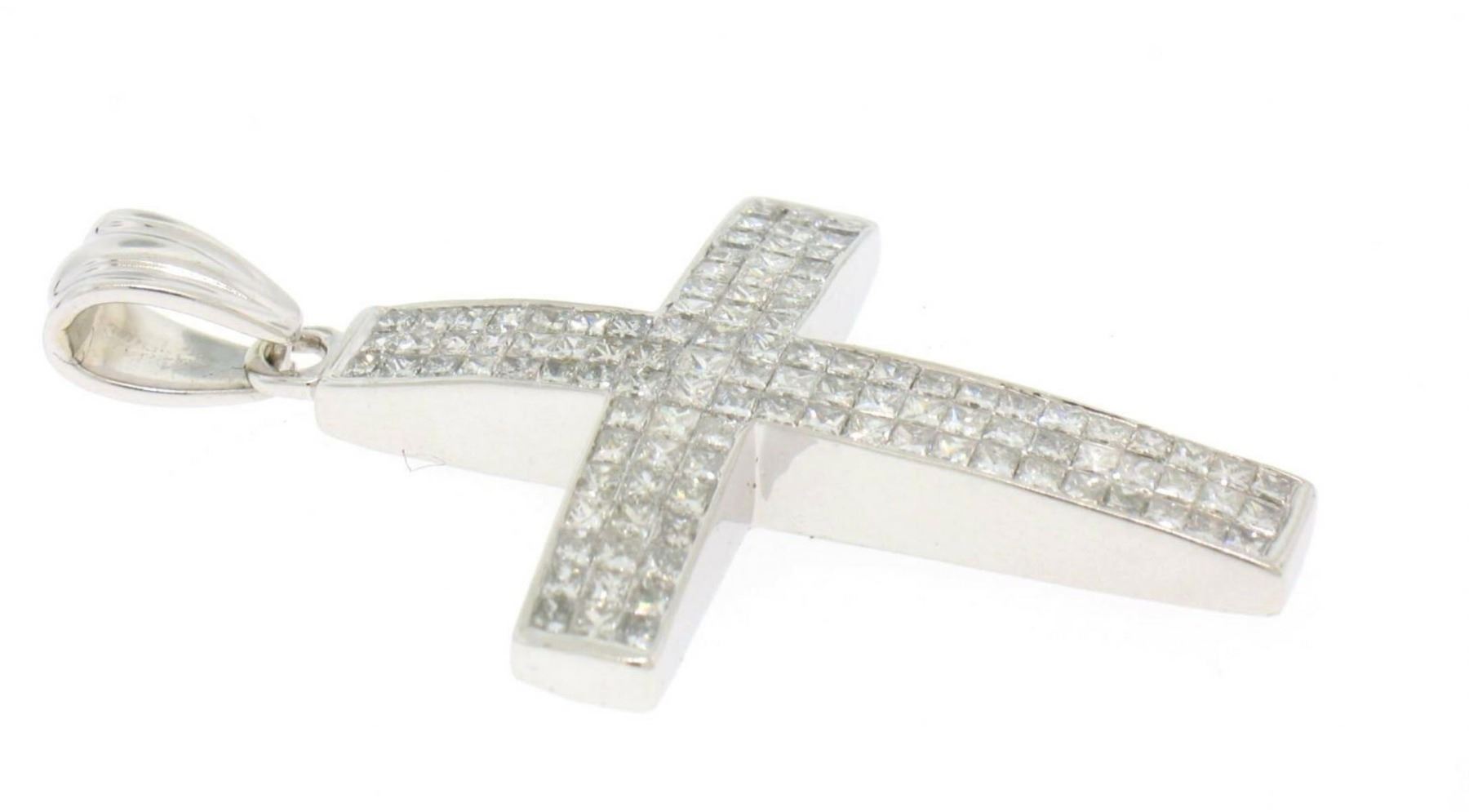 One Unisex 14K White Gold 3.25ctw Arched Invisible Set Princess Cut Diamond Cross. Item Details: Material: 14K Solid White Gold, Weight: 6.50 Grams, Stone: (108) Natural Genuine Diamonds - Princess Cut - Invisible Set - G/H Color - SI1 Clarity - 3.25ctw (approx.), Width: 25.91mm, Height (w/o Bail): 37.78mm, Height (w/ Bail): 47.74mm, Thickness: 4.69mm, Chain: Not Included. Condition: Like New