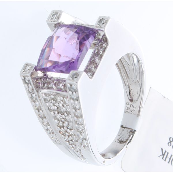 14K White Gold 3.30ctw Amethyst & Diamond Ring **|**|** 14K White Gold 3.30ctw Amethyst & Diamond Ring --- 78 Diamonds @0.88CT --- 1 Amethyst @2.42CT --- Metal weight: 6.30 grams --- Metal: 14K White Gold --- SKU#173377 *** ; MSRP: $4600