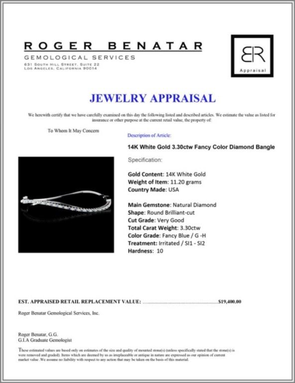 Regarding Appraised Jewelry and Loose Stones - Auctionfarm sends them out to a third party for Retail Replacement Value Appraisals, which are the most common. These types of evaluations are written for insurance needs. This would be the cost to replace the jewelry with an item of equal quality and kind, considered to be the current market price or the replacement value. This type of appraisal is done to protect you in the event of damage or loss of a valuable item. Our appraisals are conducted by independent 3rd Party appraisal firms that utilizes Certified GIA Gemologist. Appraisals should be used for verification of gemstone and/or metal weight, size, and grade only, not actual value. Appraisal value should be considered for insurance purposes only, not actual value, as price varies greatly from retail locations thru out the world. Items should not be purchased with the expectation to resell for appraisal price, or for profit.
