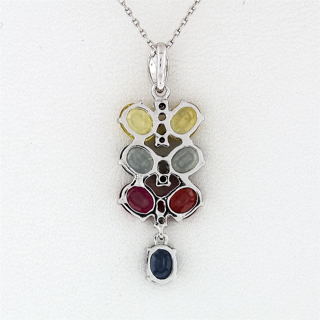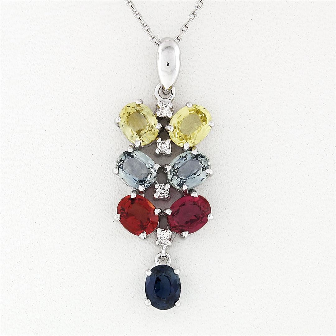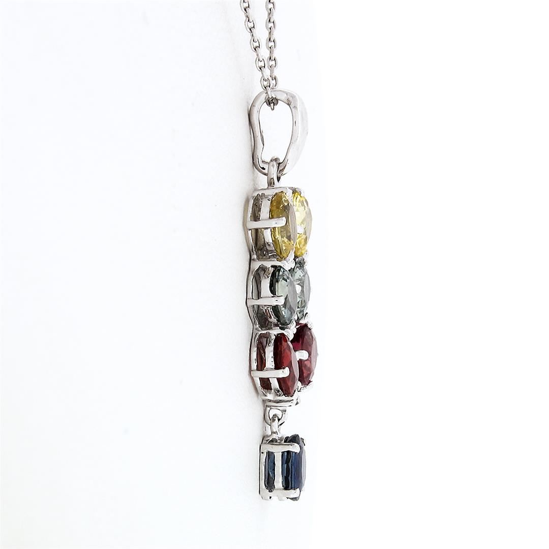 A soldi 14k white gold pendant necklace. with 7 oval cut natural sapphires (3.5ctw), & 1 round brilliant cut natural diamond (G/H- VS1/VS2; 0.04ct). 16 inch xxxxx link chain, 3.38 grams total weight, pendant measures 30.8x11.5mm.