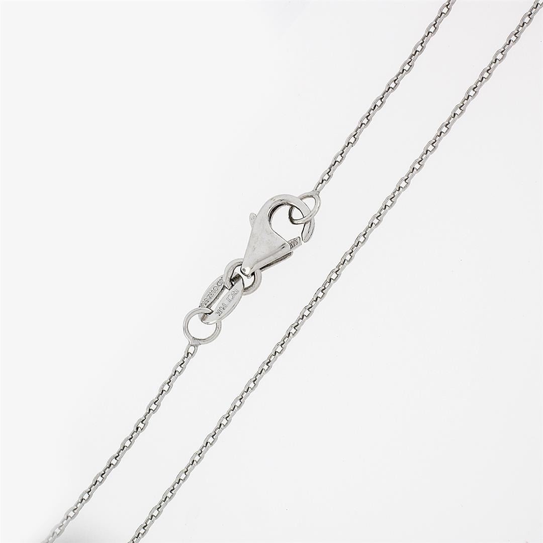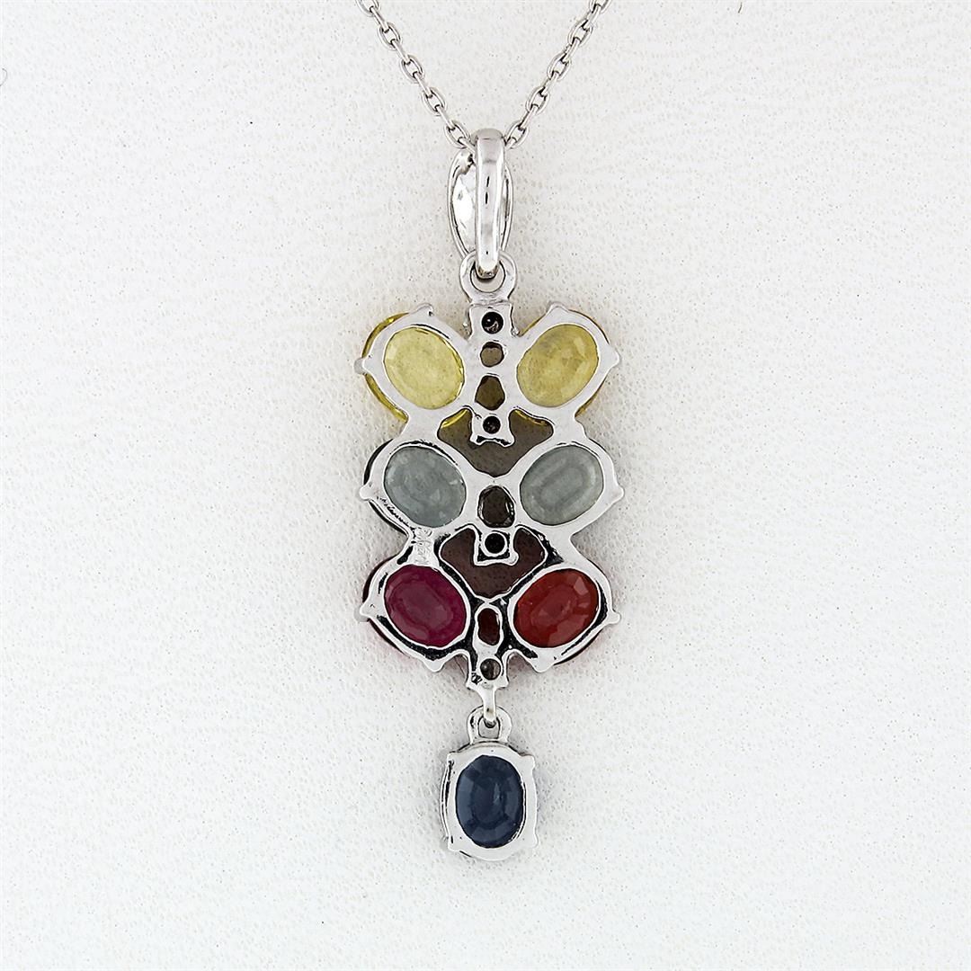 A soldi 14k white gold pendant necklace. with 7 oval cut natural sapphires (3.5ctw), & 1 round brilliant cut natural diamond (G/H- VS1/VS2; 0.04ct). 16 inch xxxxx link chain, 3.38 grams total weight, pendant measures 30.8x11.5mm.