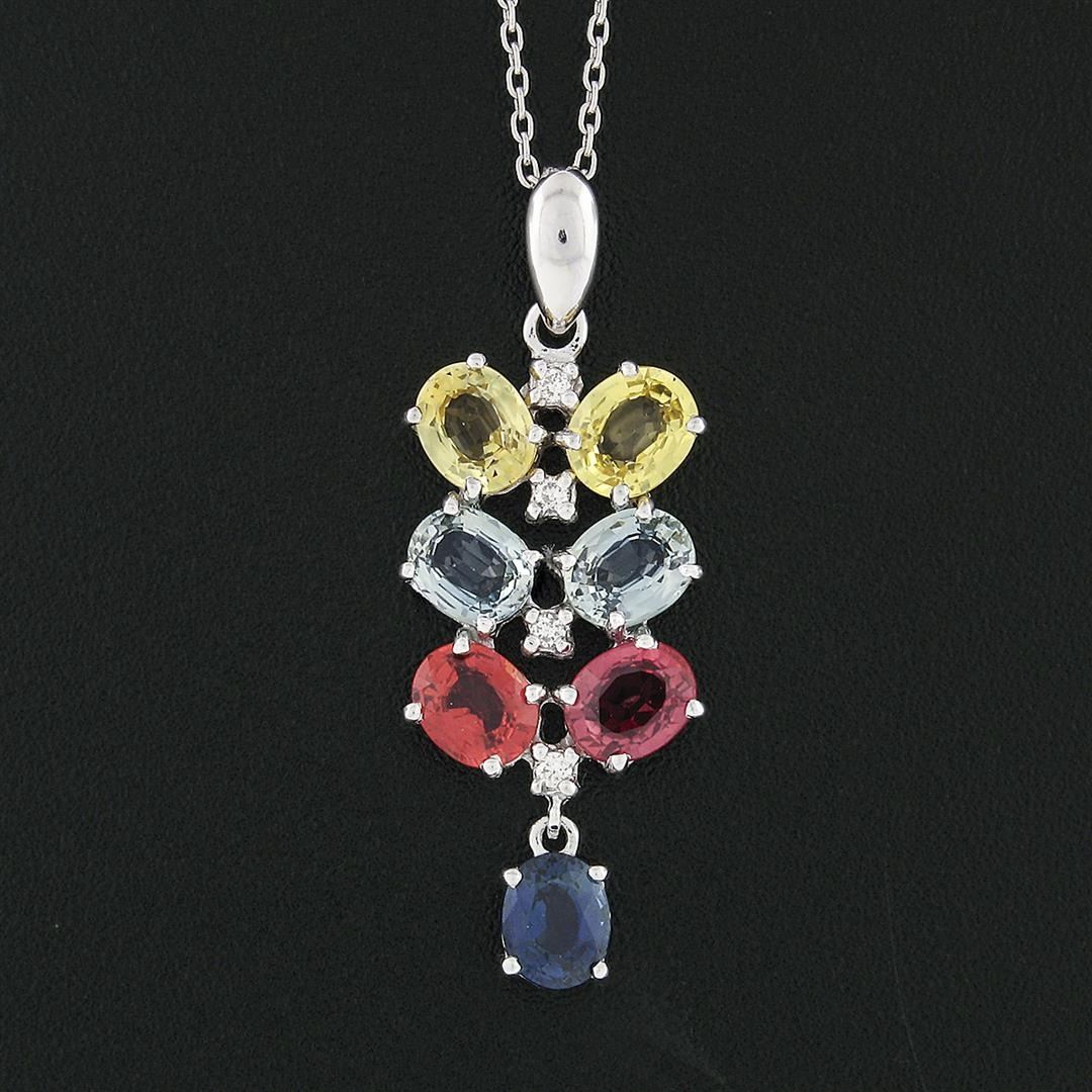 A soldi 14k white gold pendant necklace. with 7 oval cut natural sapphires (3.5ctw), & 1 round brilliant cut natural diamond (G/H- VS1/VS2; 0.04ct). 16 inch xxxxx link chain, 3.38 grams total weight, pendant measures 30.8x11.5mm.