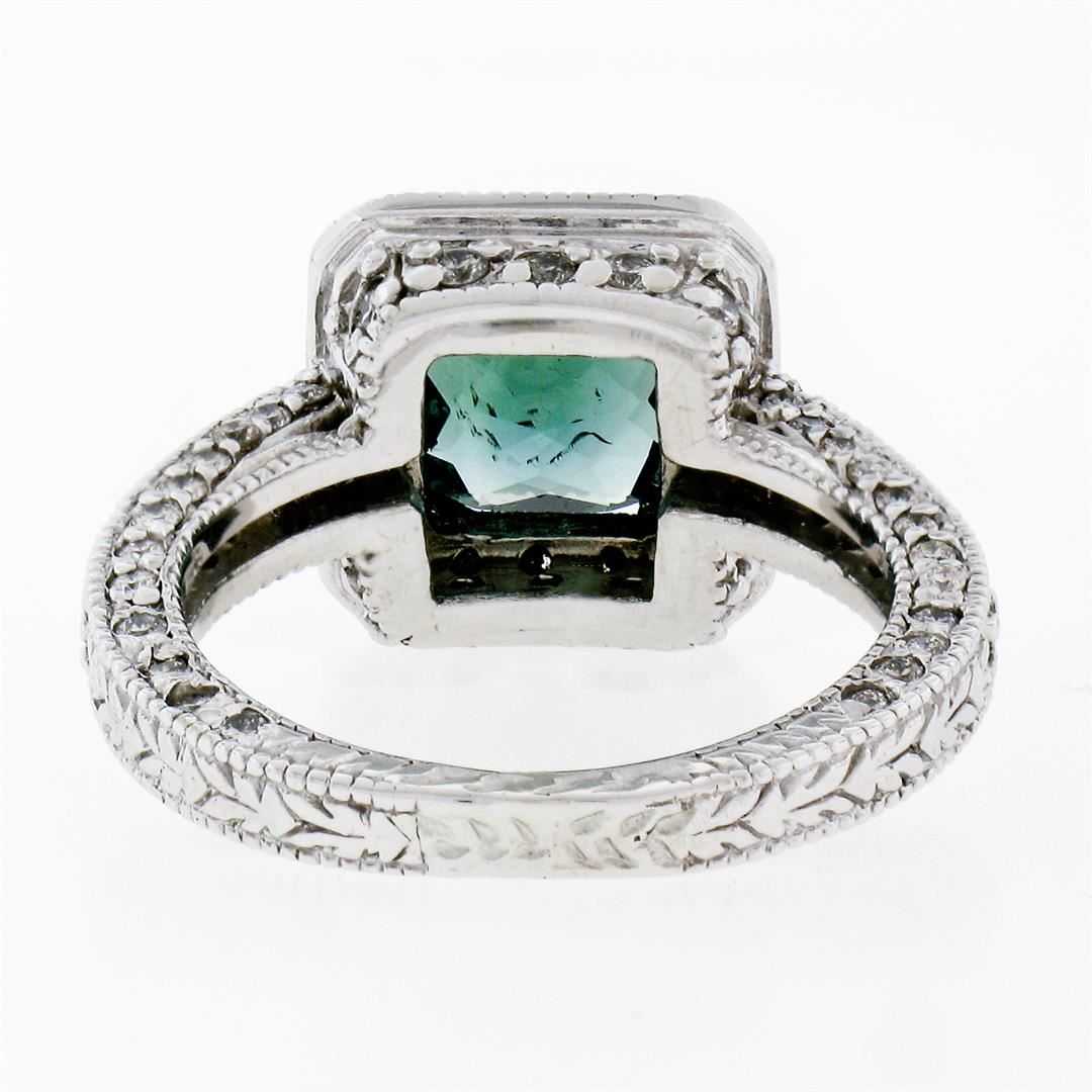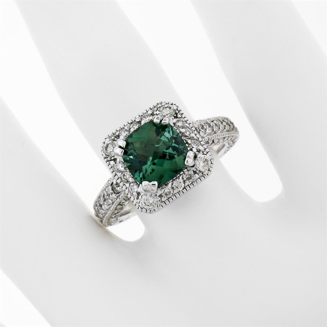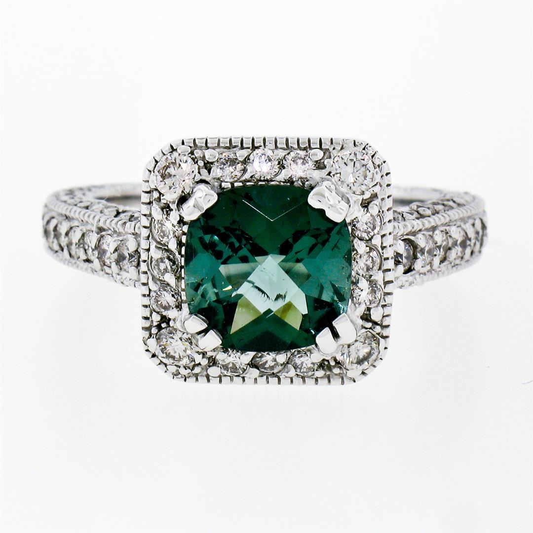 An estate solid 14k white gold solitaire ring, with 1 cushion checkerboard cut natural tourmaline (8.15x8.15mm - 2.25ct), and 90 round brilliant cut natural diamonds (G/H- VS1/VS2; 0.40ctw).The ring is size 7.0, weighs a total of 9.07 grams, and measures 12.30mm wide.