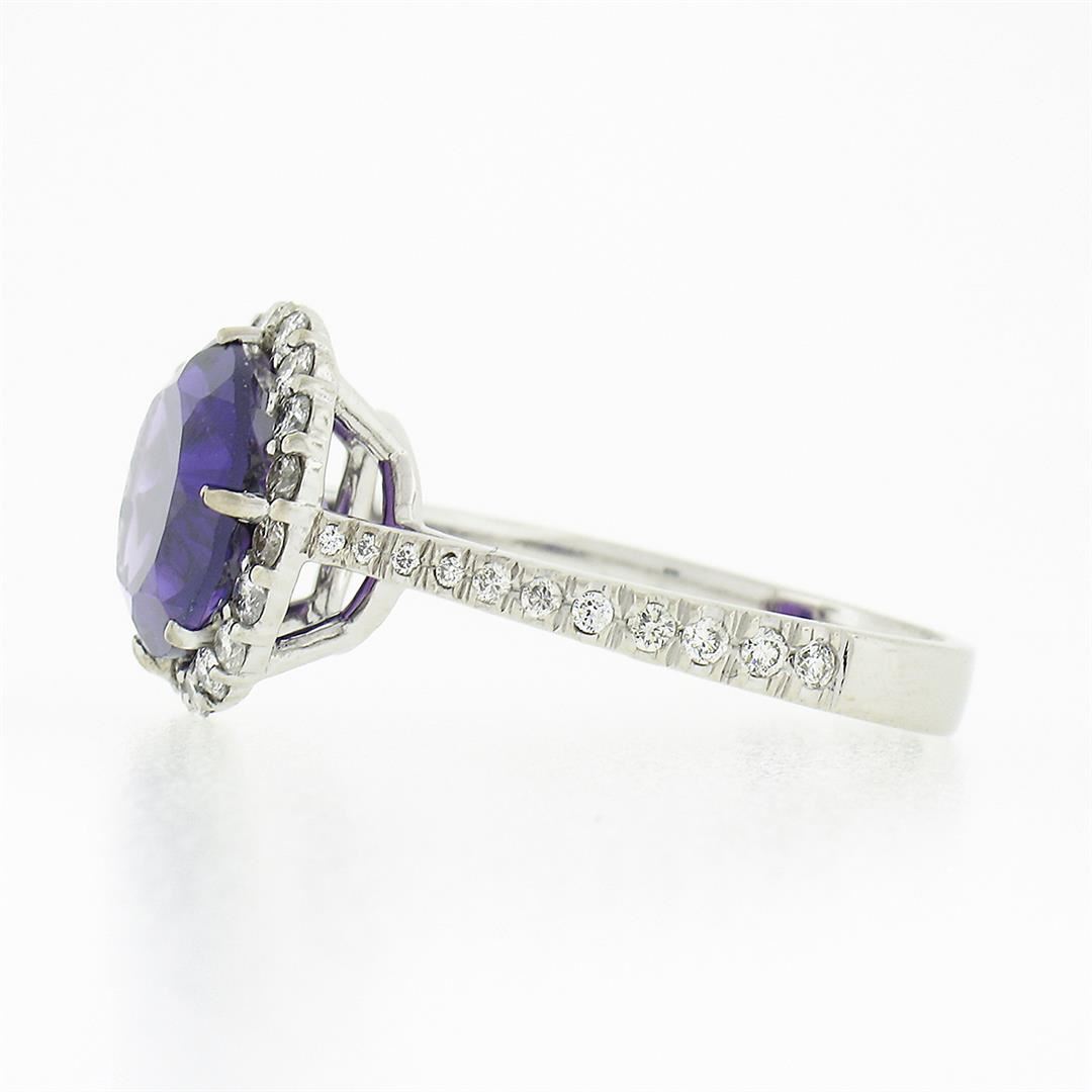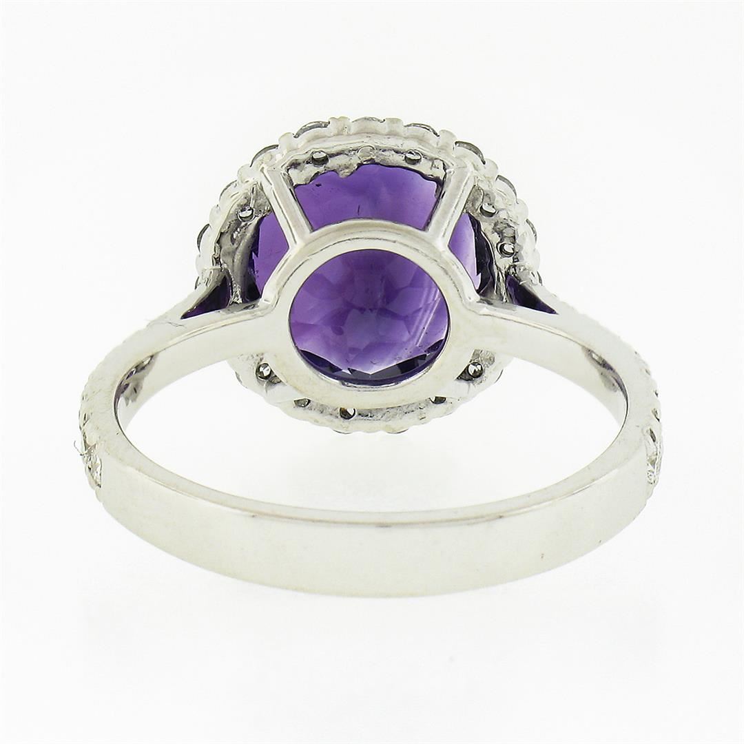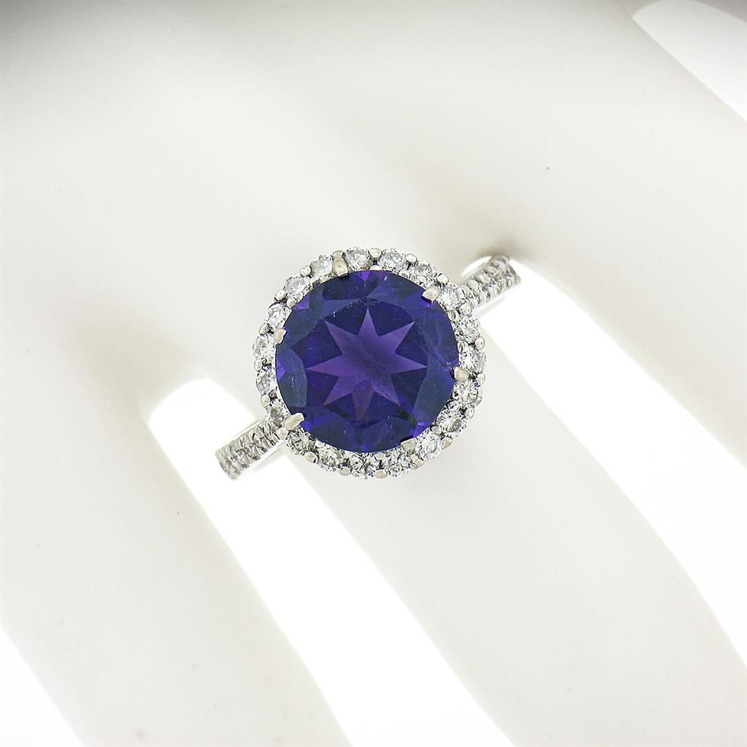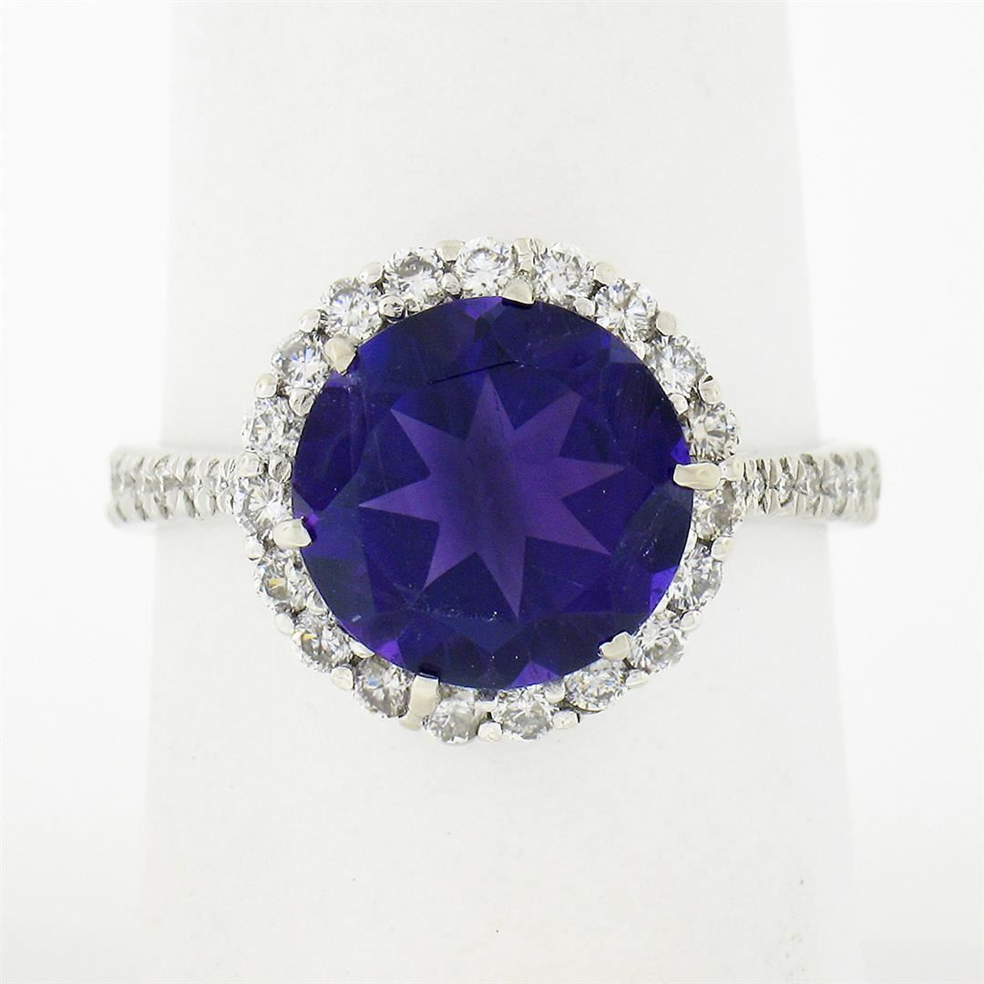 A solid 14k white gold ring, with 1 round brilliant cut natural amethyst (10mm - 3.3ct), surrounded with a halo of 39 round brilliant cut natural diamonds (G/H - VS2 ; 0.80ctw).The ring is size 7.5, weighs a total of 3.84 grams, and measures 12.85mm wide.