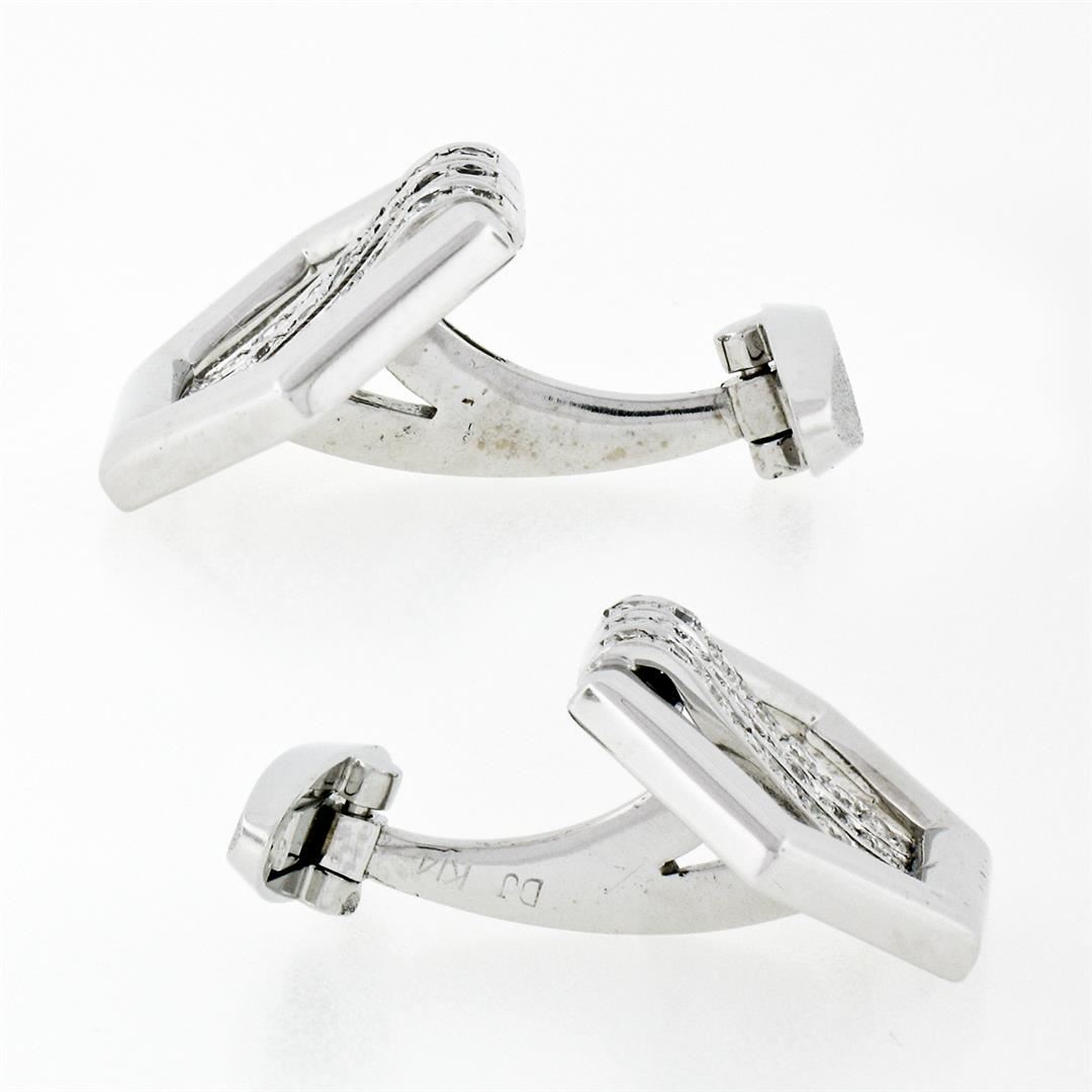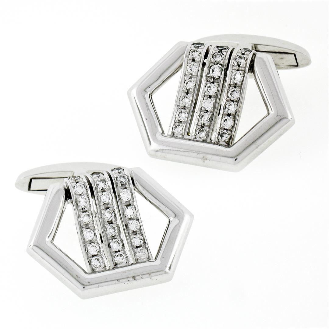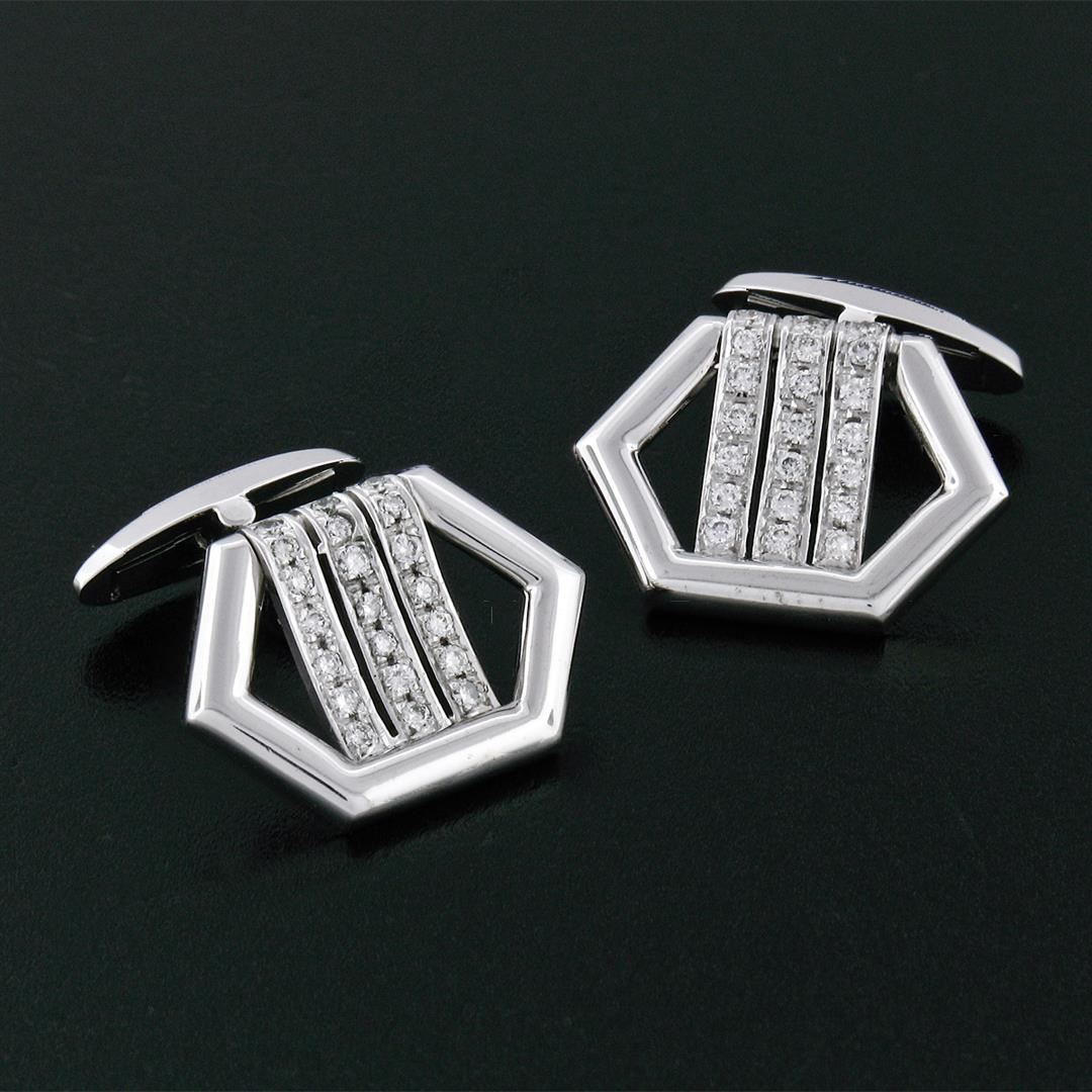An estate solid 14k white gold cuuflinks, with 42 ideal round brilliant cut natural diamonds (F/G - VS1/VS2; 0.60ctw). These cuff links have a swivel design with a clearance of 14.0mm, weigh a total of 10.51 grams, and the front panels measure 15x20.85mm.