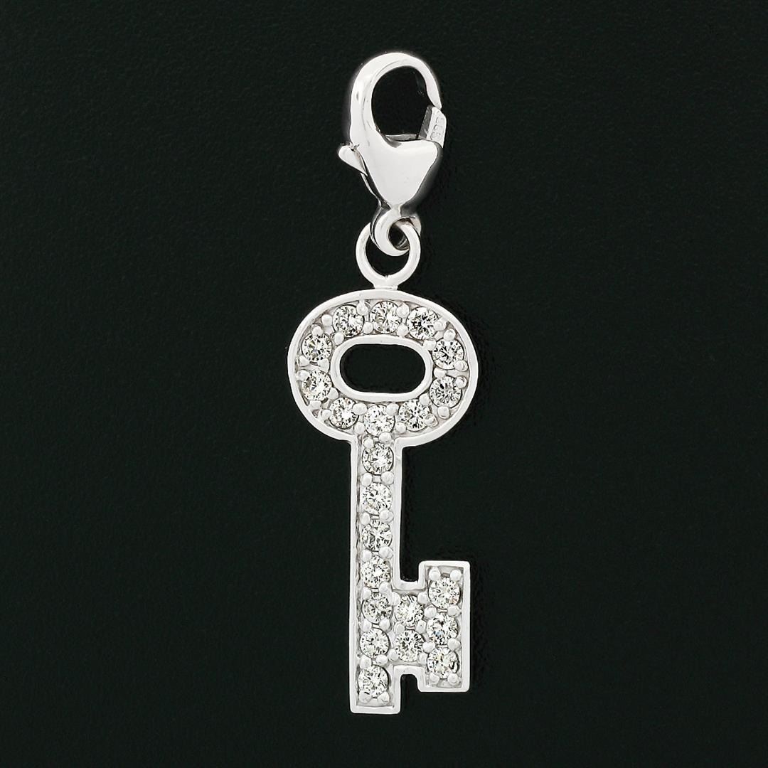 A solid 14k white gold long lock key dangle charm pendant, with 22 round brilliant cut natural diamonds (F/G - VS2/SI1; 0.66ctw). The pendant weighs a total of 2.01 grams, measures 37.2x10.7mm including the bail, and the inside of the bail measures 3.6mm