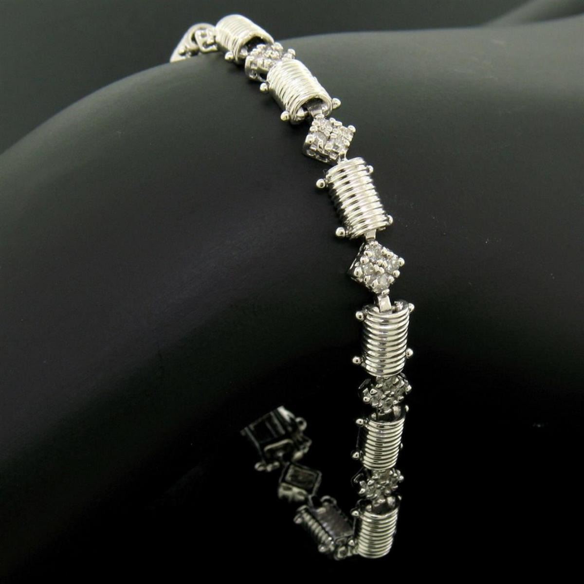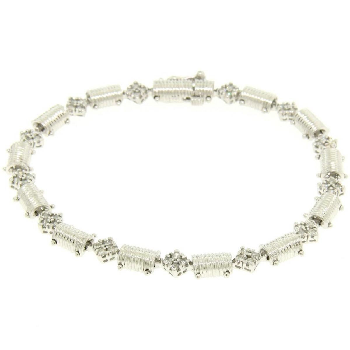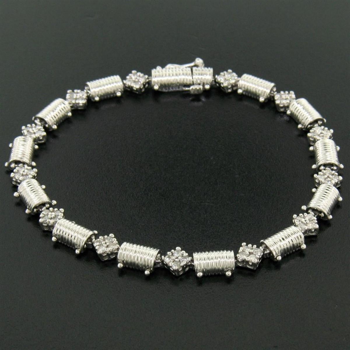 One 14K White Gold 7.25" 1.30ctw Round Diamond Cluster & Ribbed Link Tennis Bracelet. Item Details: Material: 14K Solid White Gold, Weight: 11.79 Grams, Stone(s): (52) Natural Genuine Diamonds - Round Brilliant Cut - Prong Set - VS2/SI1 Clarity - G/H Color, Total Carat Weight: 1.30 (approx.), Type: Ribbed Half Cylinder and Square Diamond Cluster Link, Length: 7.25 Inches, Clasp: Box-Type Clasp w/ Safety Latch, Width: 6.3mm Thickness: 3.58mm rise off the wrist Condition: Like New!