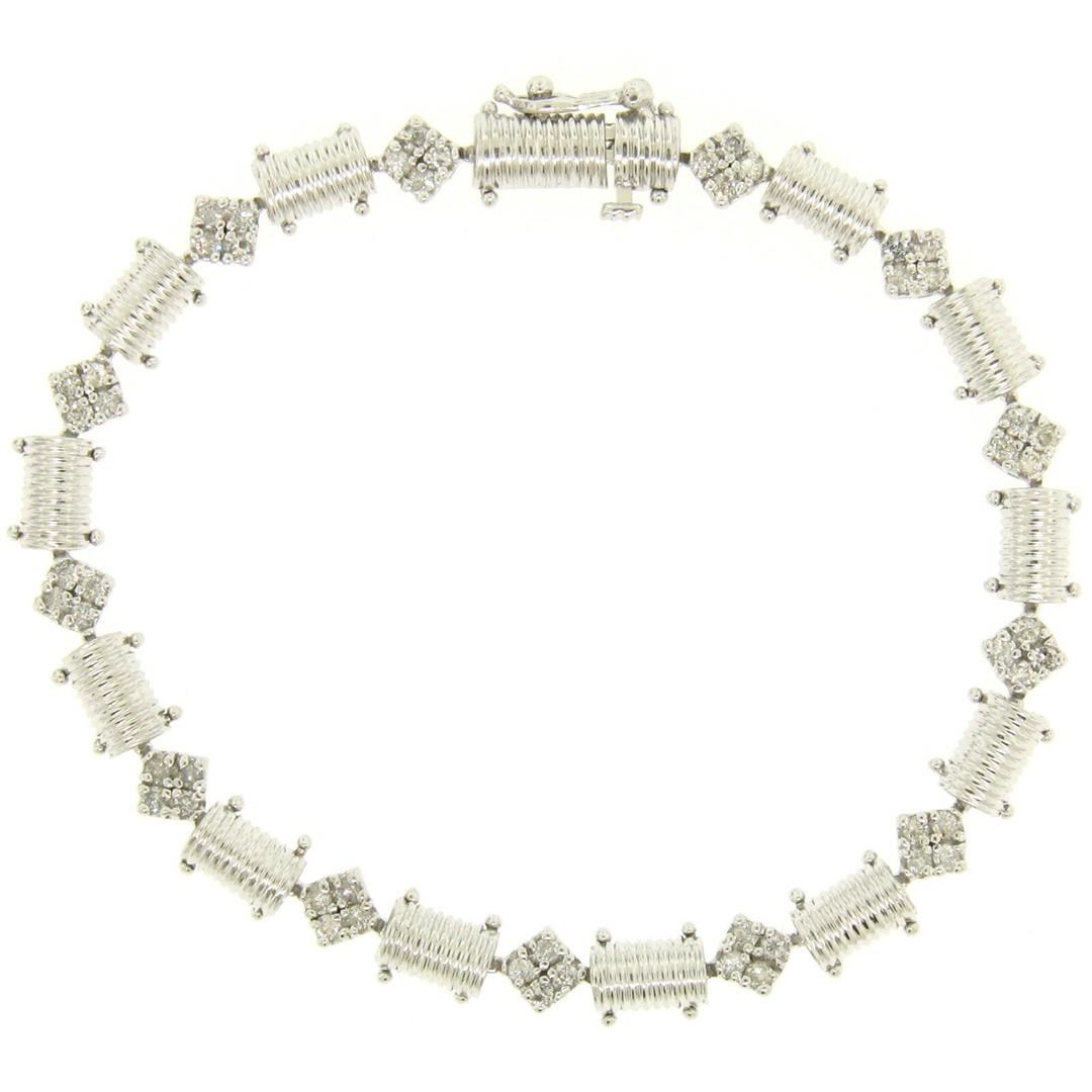One 14K White Gold 7.25" 1.30ctw Round Diamond Cluster & Ribbed Link Tennis Bracelet. Item Details: Material: 14K Solid White Gold, Weight: 11.79 Grams, Stone(s): (52) Natural Genuine Diamonds - Round Brilliant Cut - Prong Set - VS2/SI1 Clarity - G/H Color, Total Carat Weight: 1.30 (approx.), Type: Ribbed Half Cylinder and Square Diamond Cluster Link, Length: 7.25 Inches, Clasp: Box-Type Clasp w/ Safety Latch, Width: 6.3mm Thickness: 3.58mm rise off the wrist Condition: Like New!
