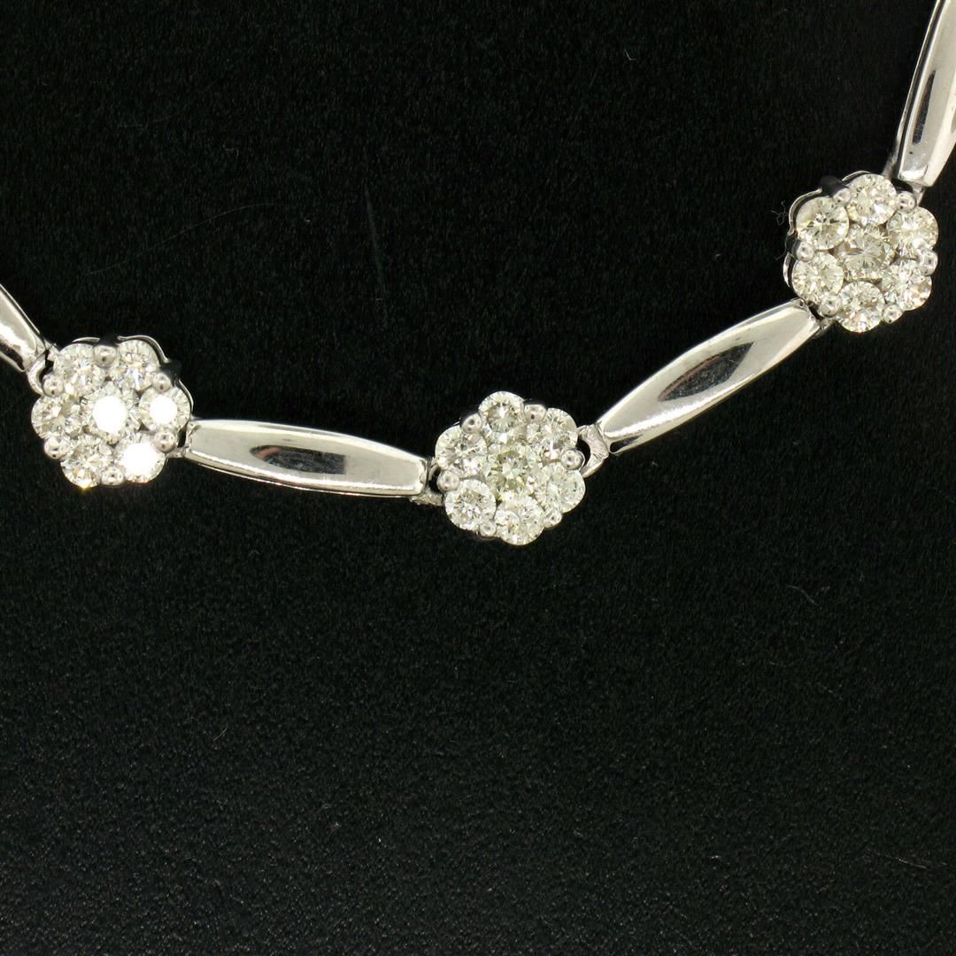 One 14K White Gold 7" 4.65ctw Round Diamond Flower Cluster & Bar Link Tennis Bracelet. Item Details: Material: 14K Solid White Gold, Weight:14.3 Grams, Stone(s): (63) Natural Genuine Diamonds - Round Brilliant Cut - Prong Set - VS2/SI1 Clarity - H/I Color - 4.65ctw (approx.), Chain Type: Round Diamond Flower Clusters w/ Bar Links Between, Chain Length: 7 Inches, Clasp: Push-Type Clasp w/ Safety Latch, Width: 8.15mm (clusters), 3.25mm (links), Thickness: 4.6mm rise off the wrist