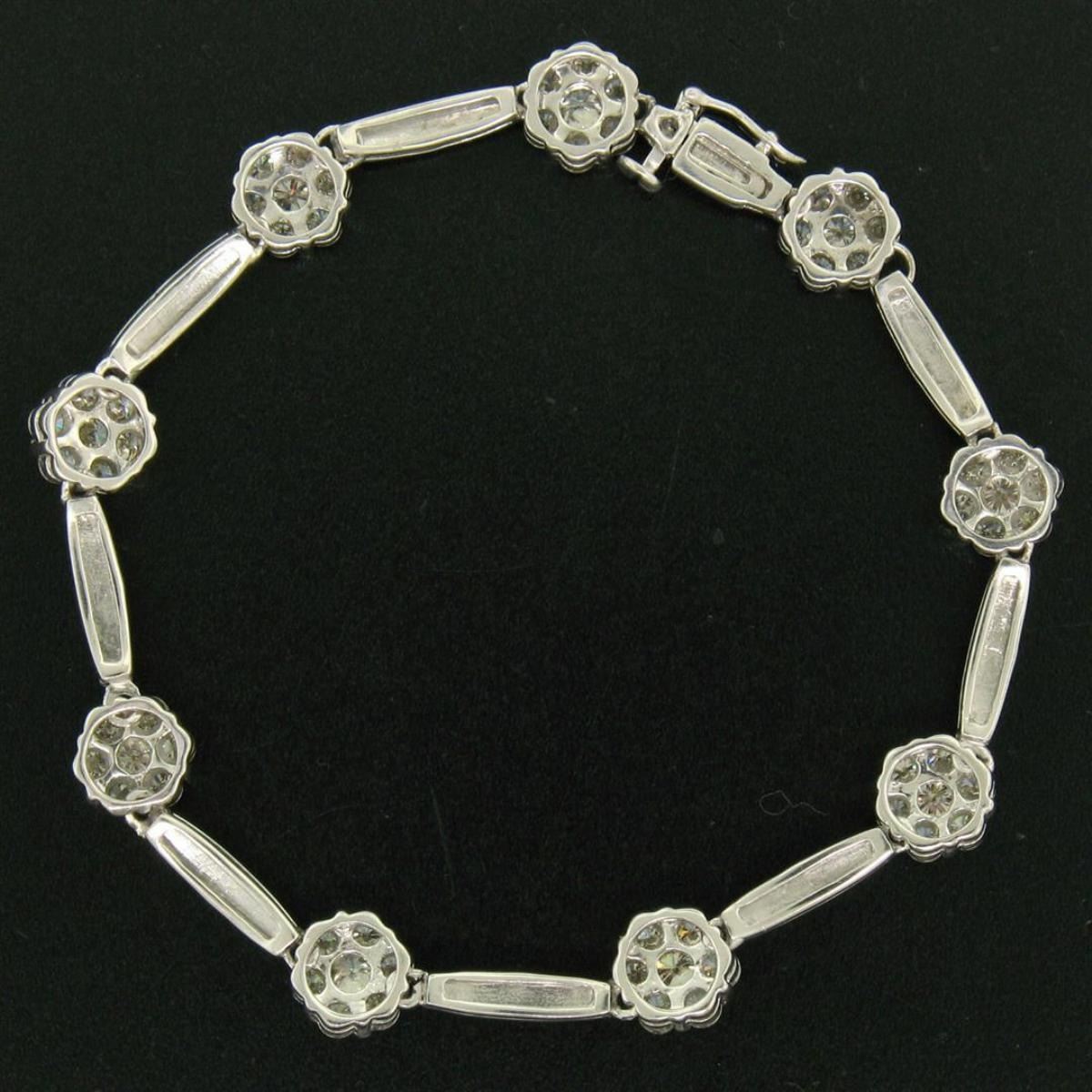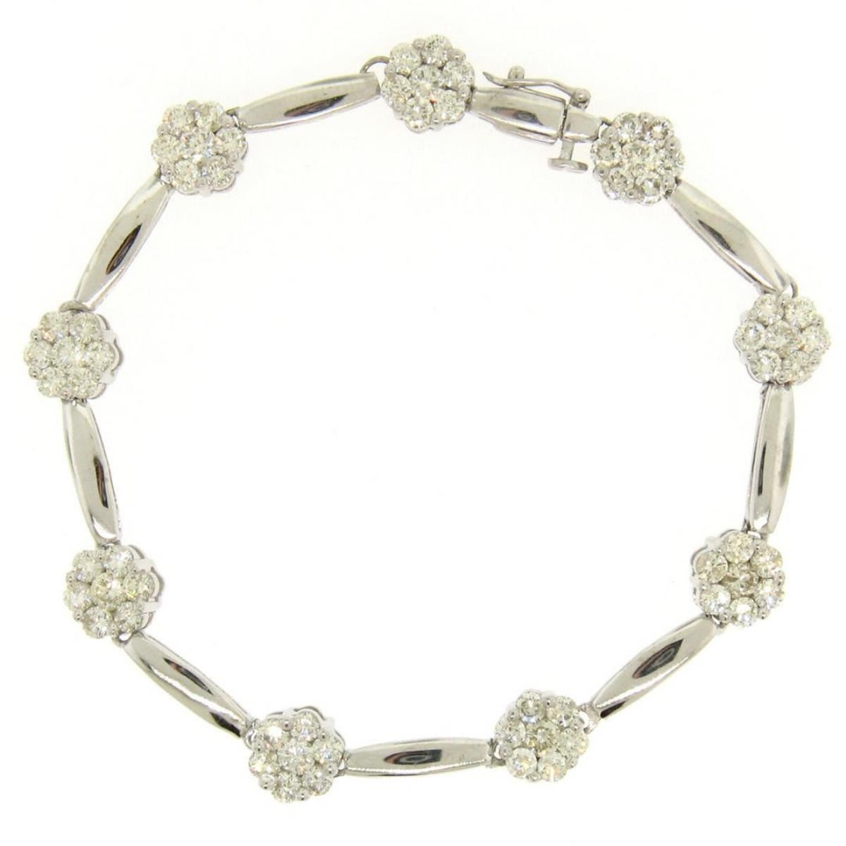 One 14K White Gold 7" 4.65ctw Round Diamond Flower Cluster & Bar Link Tennis Bracelet. Item Details: Material: 14K Solid White Gold, Weight:14.3 Grams, Stone(s): (63) Natural Genuine Diamonds - Round Brilliant Cut - Prong Set - VS2/SI1 Clarity - H/I Color - 4.65ctw (approx.), Chain Type: Round Diamond Flower Clusters w/ Bar Links Between, Chain Length: 7 Inches, Clasp: Push-Type Clasp w/ Safety Latch, Width: 8.15mm (clusters), 3.25mm (links), Thickness: 4.6mm rise off the wrist