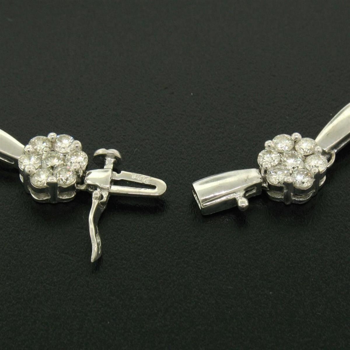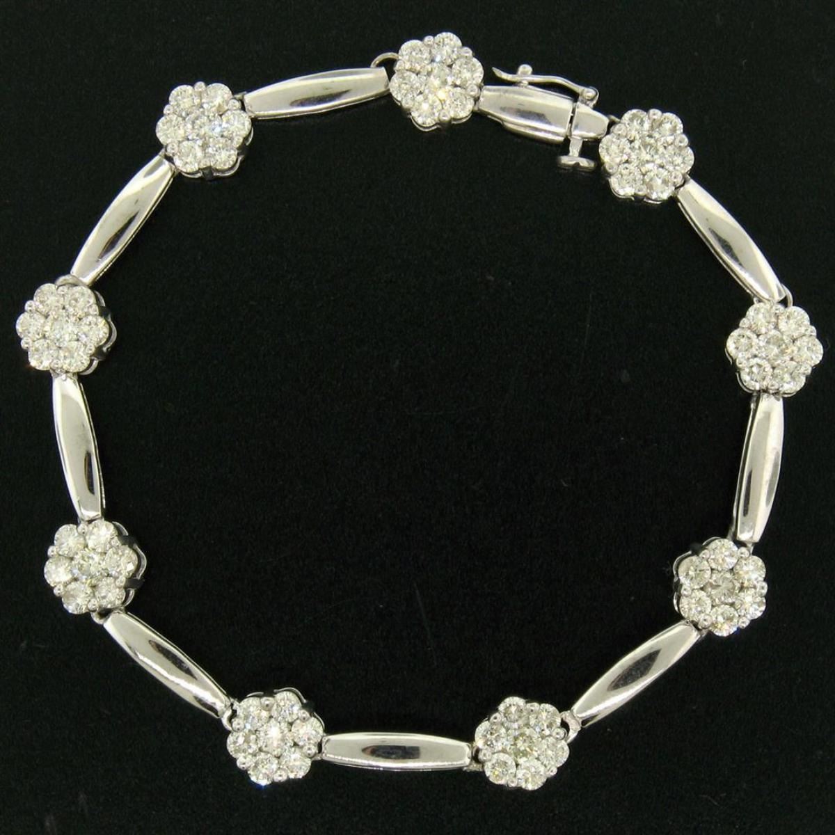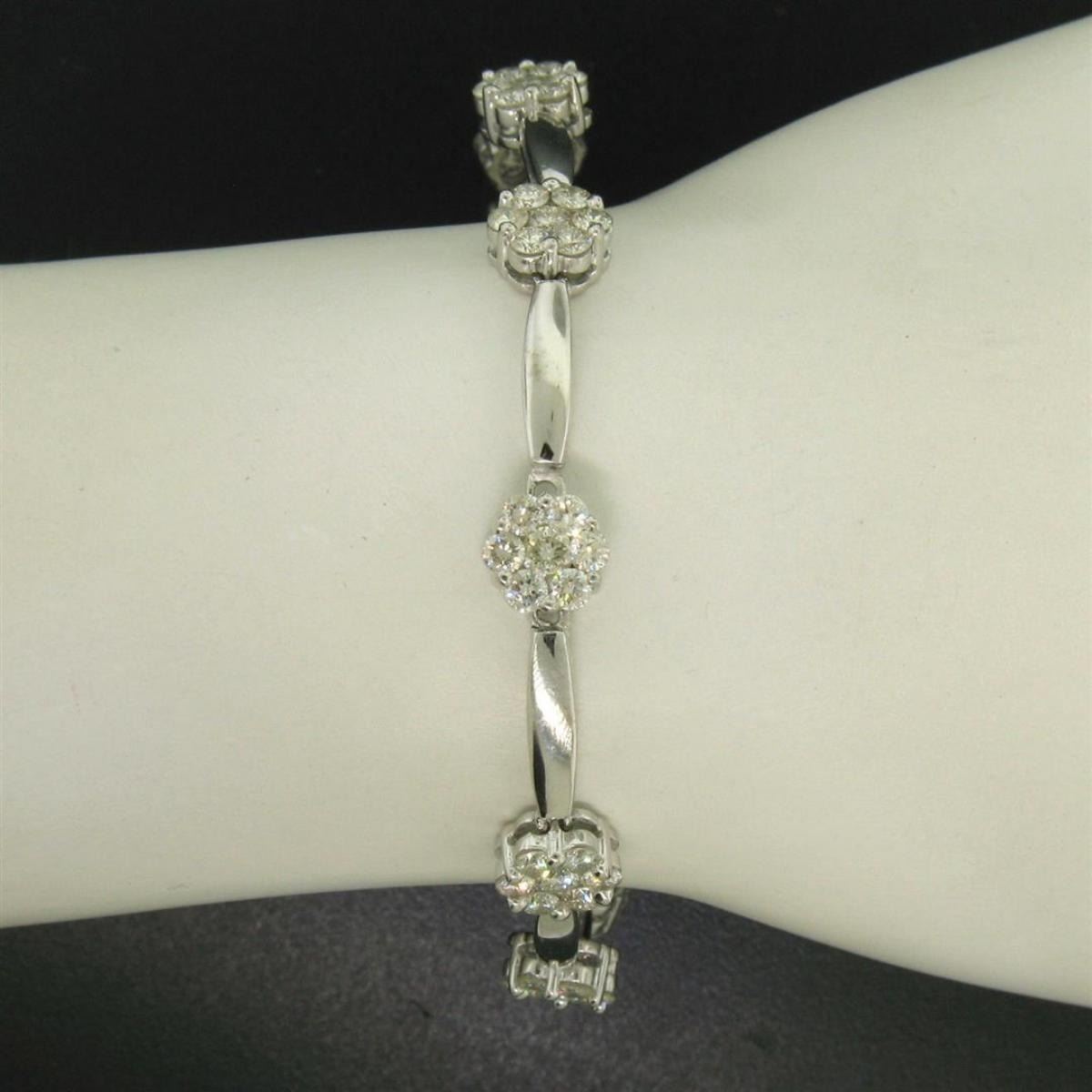 One 14K White Gold 7" 4.65ctw Round Diamond Flower Cluster & Bar Link Tennis Bracelet. Item Details: Material: 14K Solid White Gold, Weight:14.3 Grams, Stone(s): (63) Natural Genuine Diamonds - Round Brilliant Cut - Prong Set - VS2/SI1 Clarity - H/I Color - 4.65ctw (approx.), Chain Type: Round Diamond Flower Clusters w/ Bar Links Between, Chain Length: 7 Inches, Clasp: Push-Type Clasp w/ Safety Latch, Width: 8.15mm (clusters), 3.25mm (links), Thickness: 4.6mm rise off the wrist