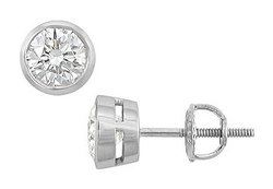 A pair of perfectly matched round diamonds are set in a rich 14K white gold bezel-setting. These diamond stud earrings have a total weight (TDW) of 1.50 carats and are available in either screw-back or push-back. The TDW includes the combined weight of both diamonds.