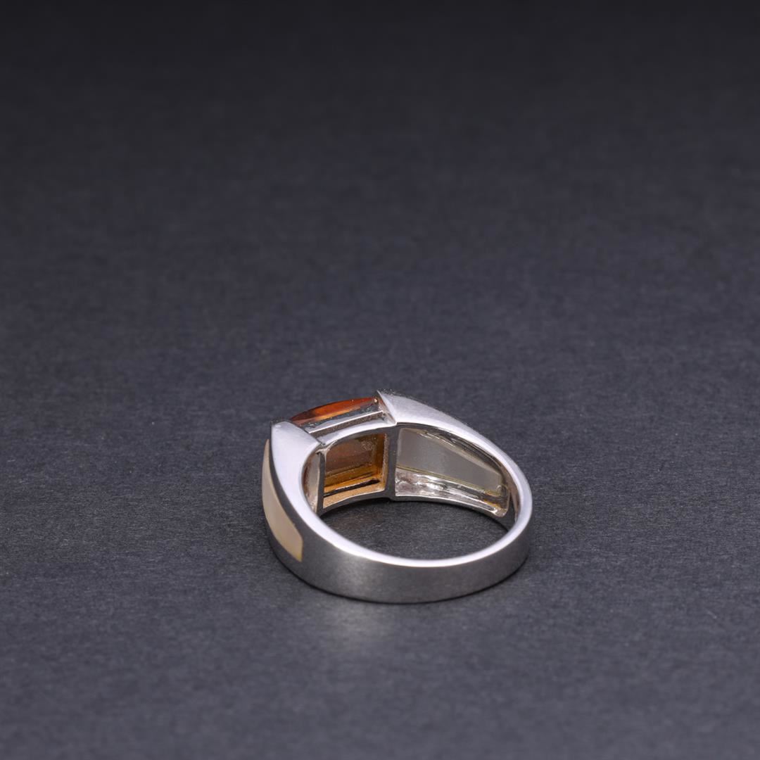 14K White Gold & Citrine Ring containing one custom cut rectangle citrine weighing approximately 2 cts. Two pieces of inlayed crystal. Total weight of ring is 7 gm. Estimated retail value $2,200