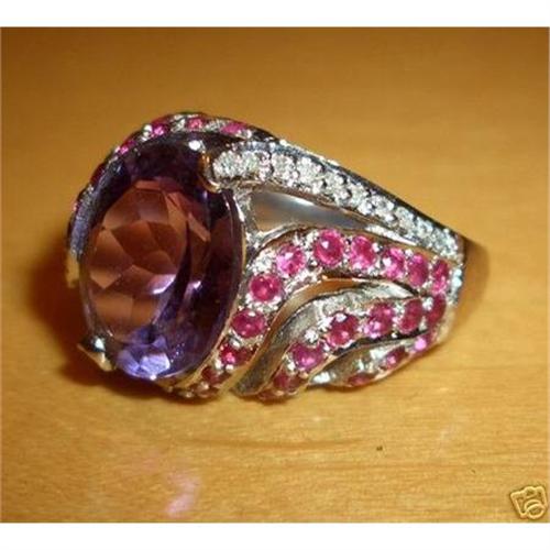 <P>Up for auction is this gorgeous ladies diamond, amethyst and ruby ring. This ring is centered by a genuine Oval Amethyst. This Amethyst is VS1 in clarity, a beautiful medium purple color, measures 12 X 9 mm, and weighs approximately 5 carats. There are forty-six genuine round Rubies set throught the shank of this ring. These Rubies are a beautiful pigeon red color, VS clarity and weigh a total of .60 carat. There are also twenty genuine round brilliant diamonds set throughout this ring. These diamonds are H color, SI in clarity and weigh a total of .10 carat. This ring is solid 14KT white gold, weighs 6.6 grams, measures 15 mm in width and is a finger size 8 1/2, which can easily be resized. This ring is brand new and will be accompanied by an appraisal by a GIA Certified Diamond Graderc with the retail replacement value of $1,675.00. I will ship this ring promptly in a beautiful gift box. Good Luck with these great deals.</P>
