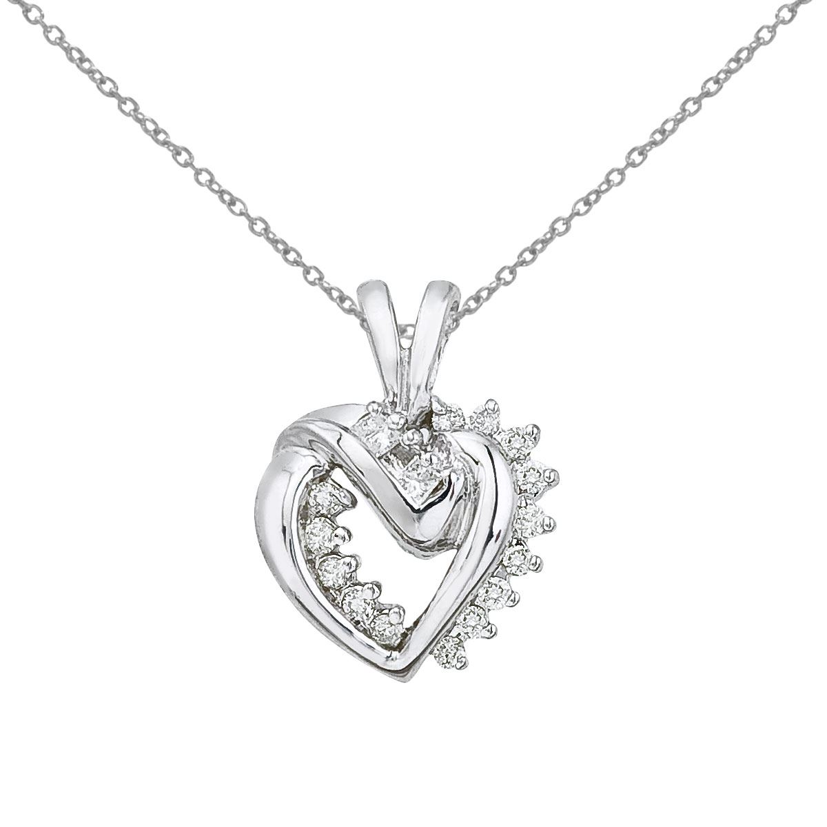 Stunning heart shaped pendant set in 14k white gold with shimmering diamonds. Includes 18" chain.