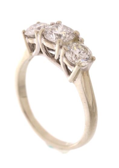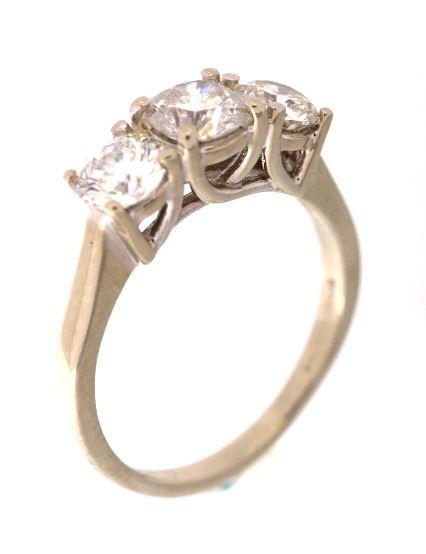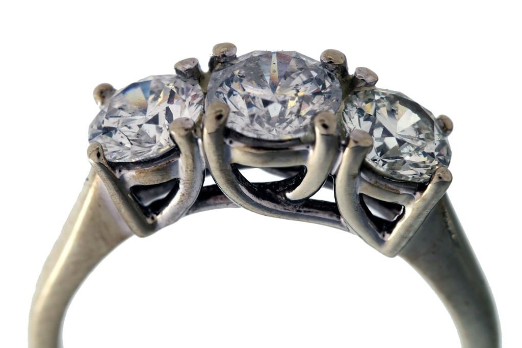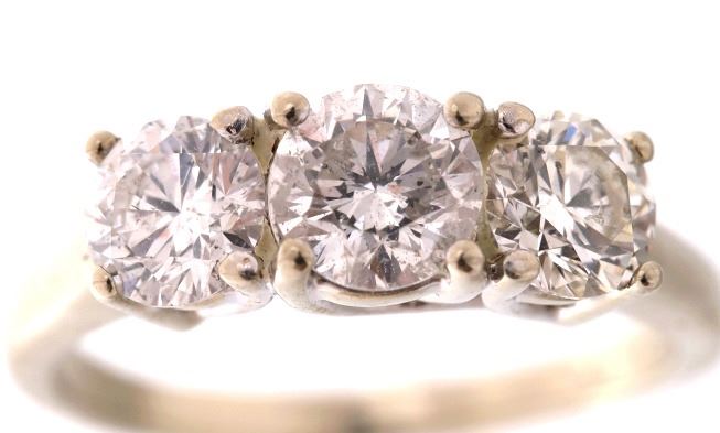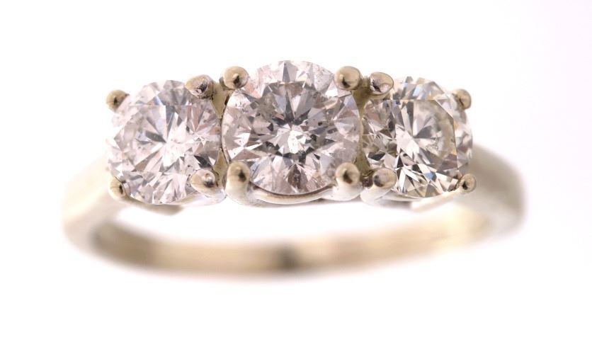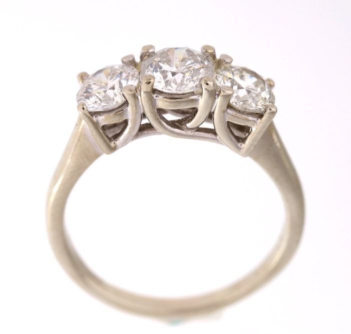 For your consideration is a gorgeous 14k white gold Magic Glo diamond ring. The diamonds appear to be nearly colorless to colorless having a color grade of D-F. This 2.1 carat Magic Glo diamond ring was made by Kay Jewelers. The combined 2.1 carat weight is composed of three stunning round cut diamonds. The two side diamonds measure 5.5mm round and the larger central ring measures 6mm round. The band is made of 14k white gold band is marked “MagicGlo” 14K. The ring truly flashes and has an excellent craftsmanship. The diamonds each show a nice white coloring and appear to be of a good quality. The ring measures a US size 8 ¼. Provenance: The ring was purchased from Kay Jewelers for over $8,500.00.