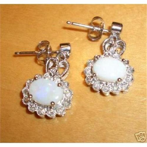 <P>Up for auction are these gorgeous diamond and opal dangle earrings. These earrings are set with one genuine irridescent opal in each earring. These opals are a beautiful color, measure 8 X 6 mm and weigh approximately 3 1/4 carats total. There are fifteen genuine Round Diamonds set in each earring. These diamonds are H color, SI/I clarity and weigh a total of .34 carats. These earrings weigh a total of 5 grams and have a friction back post for pierced ears. I will ship this ring promptly in a gift box. These earrings will be accompanied by an appraisal by a GIA Certified Diamond Grader with the retail replacement value of $1,329.00. Good Luck with these great deals.</P>