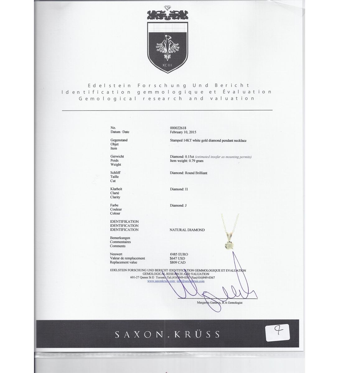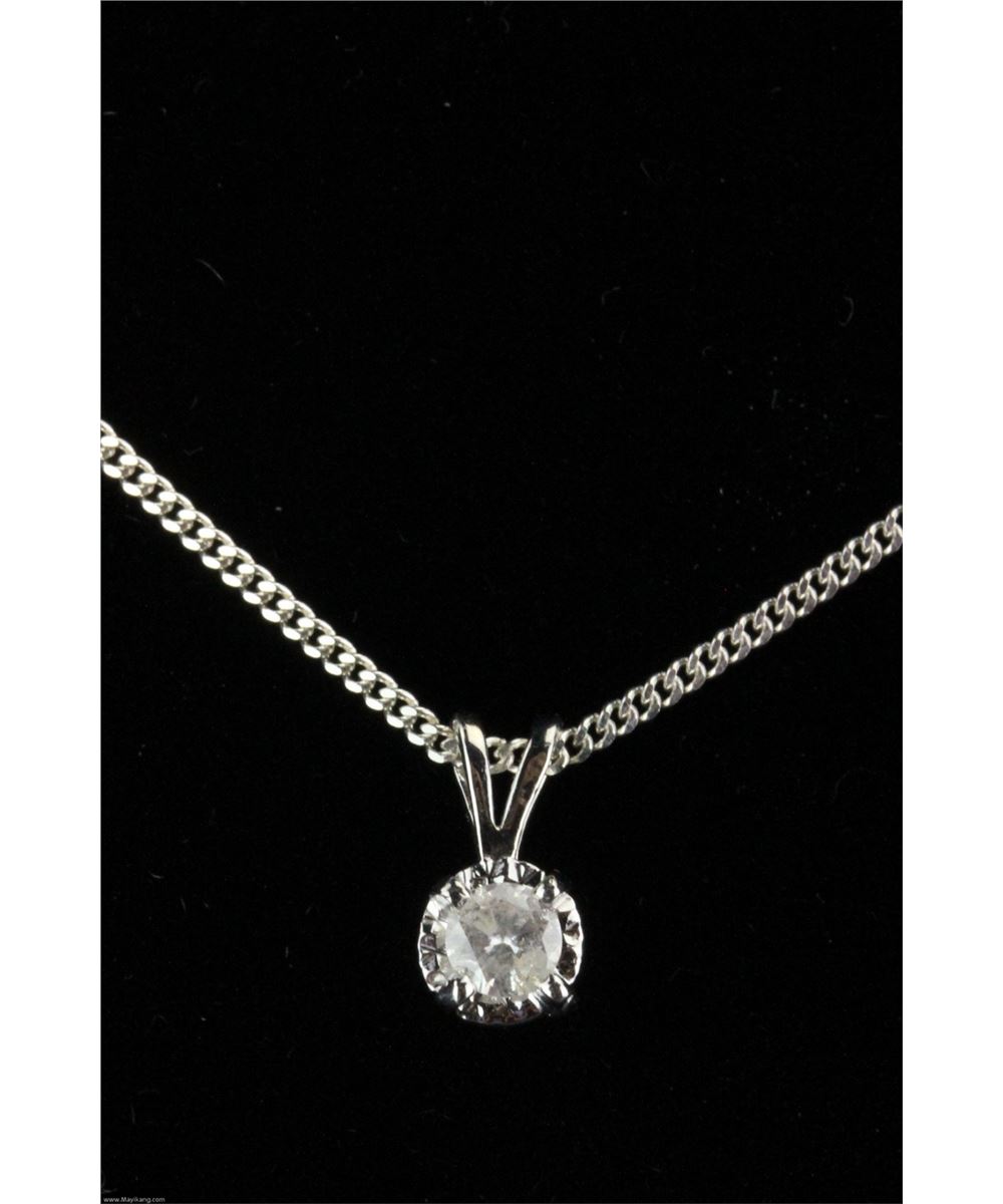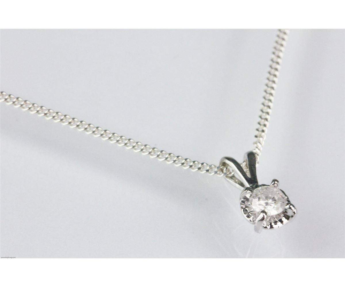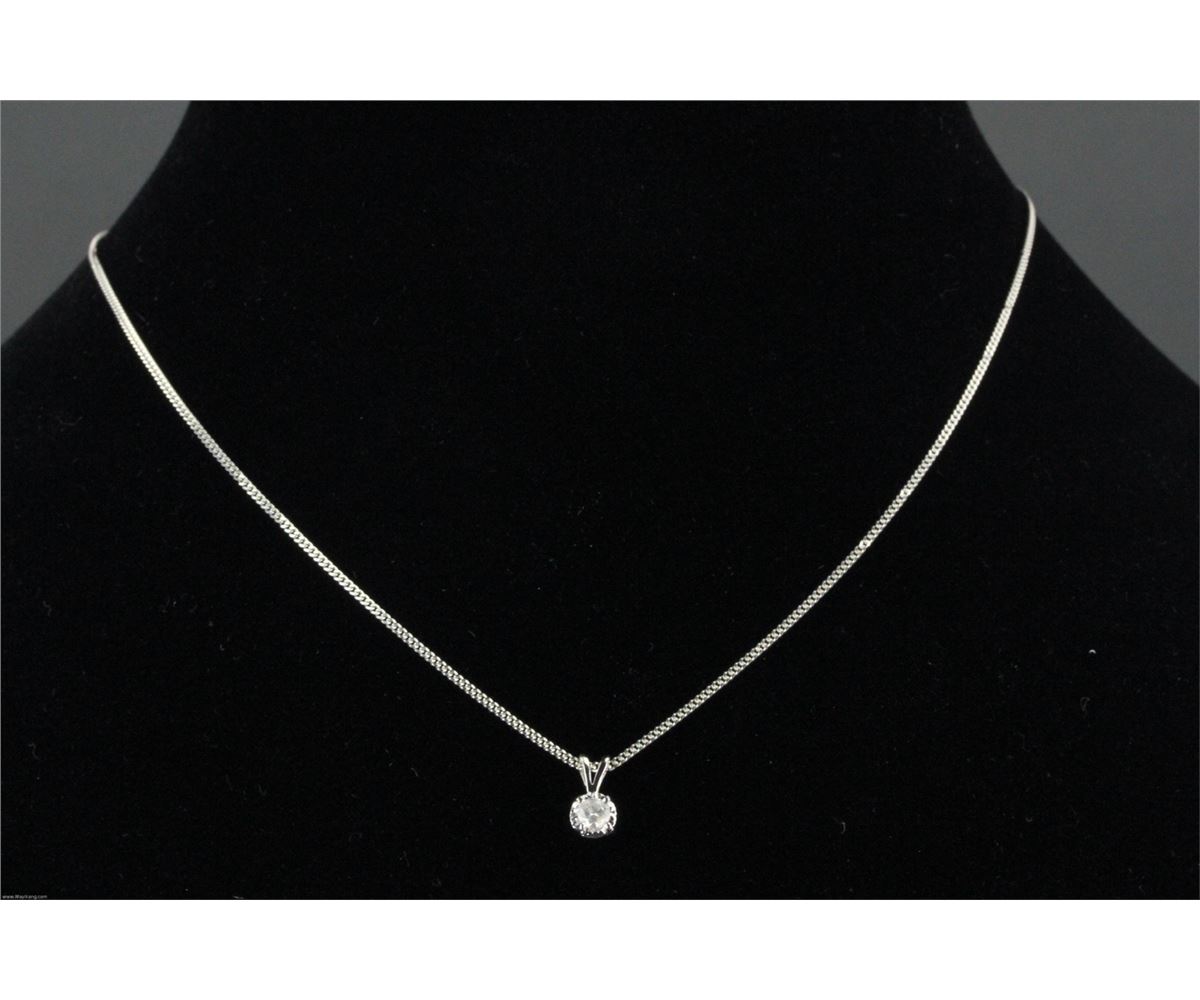 A stamped 14K white gold necklace, set with a round brilliant cut natural diamond (0.15 ct), replacement value: $809, 0.79 grams.