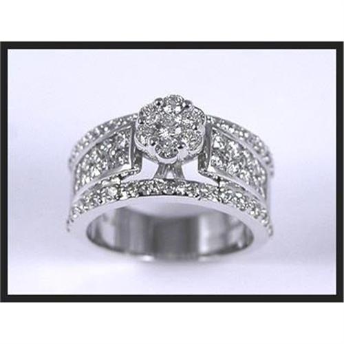 This ring is elegant and worthy of a queen. The gorgeous ring has 55 full cut diamonds that weigh 2.00 carats set in 14K white gold. The size 7 ring measures 10 millimeters (13/32 inches) wide and weighs 10.70 grams total weight. The center diamond measures 13 millimeters (5/16 inches) in diameter.