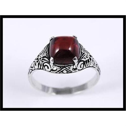 </font></strong>Intricate ring with 1 square cabochon garnet set in 14K white gold The size 7-3/4 ring measures 10.9 millimeters (0.43 inches) wide and weighs 3.50 grams total weight. The garnet measures 8.1 millimeters (0.32 inches) x 8.1 millimeters (0.32 inches).</font>