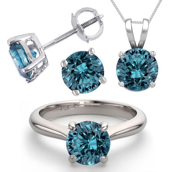 REF-569X8F ---- WJ13346 ----- Manufacturer's Suggested Retail Price: $22800.00 ----- 14K White Gold Jewelry SET 3.0CTW Blue Diamond Ring, Earrings and Necklace ----- Diamond: 4 Round cut @ 0.75 ct EACH Stone