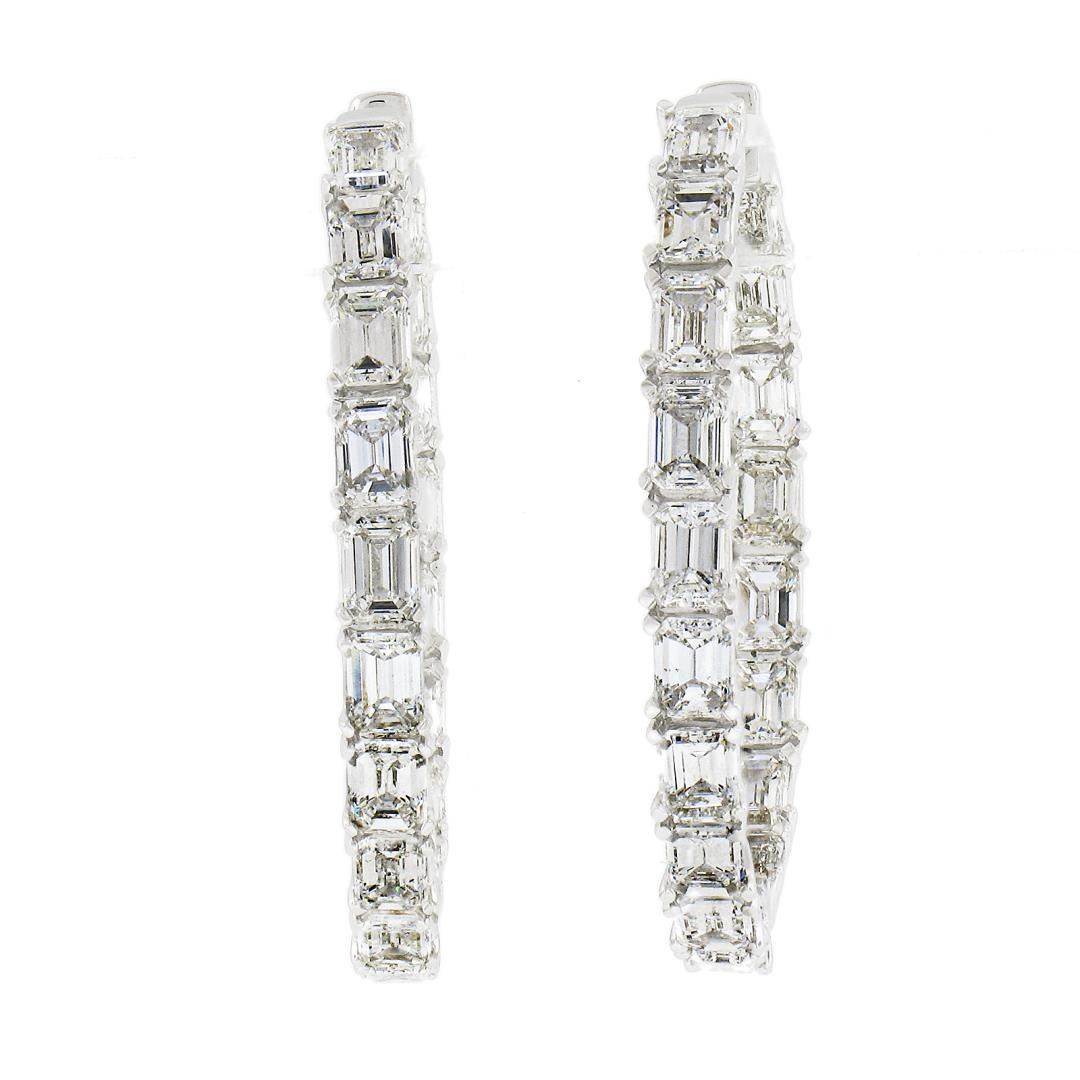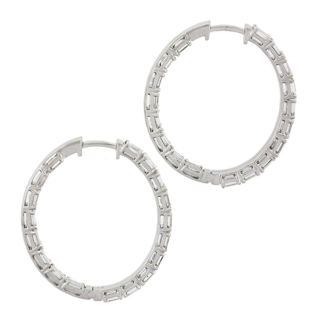 A new solid 14k white gold hoop earrings, with 36 emerald cut natural diamonds (G/H - VS1/VS2 w/ a few SI1 ; 5ctw). The earrings measure approximately 30.5x27.2mm and weigh a total of 7.19 grams.