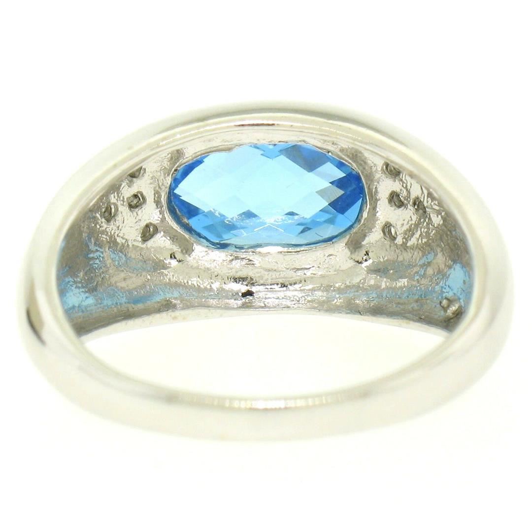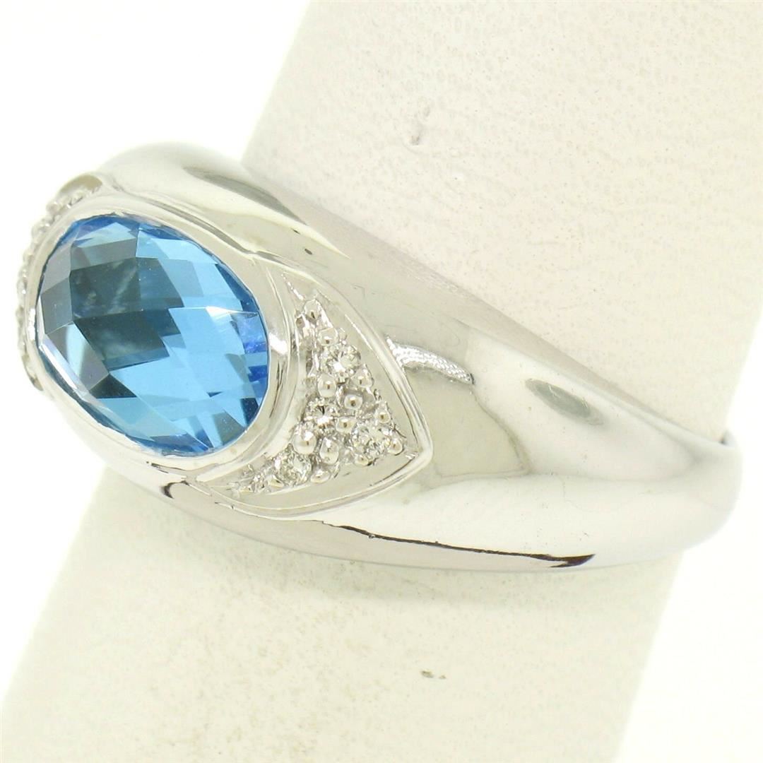 One 14K White Gold Oval Checkerboard Cut Bezel Blue Topaz Solitaire & Diamond Ring. Item Details - Material: 14K Solid White Gold, Weight: 4.3 Grams, Stone(s): (1) Natural Genuine Topaz - Pointed Oval Checkerboard Cut - Bezel Set - Rich Blue Color - 2.40ct (exact), (8) Natural Genuine Diamonds - Round Brilliant Cut - Pavé Set - F Color - SI1 Clarity - 0.08ctw (approx.), Total Carat Weight: 2.48 (approx.), Ring Size: 6.0, Ring Width: 9.5mm, Ring Height: 7mm rise off the finger, Signature: 14K 2.40, Condition: Like New!
