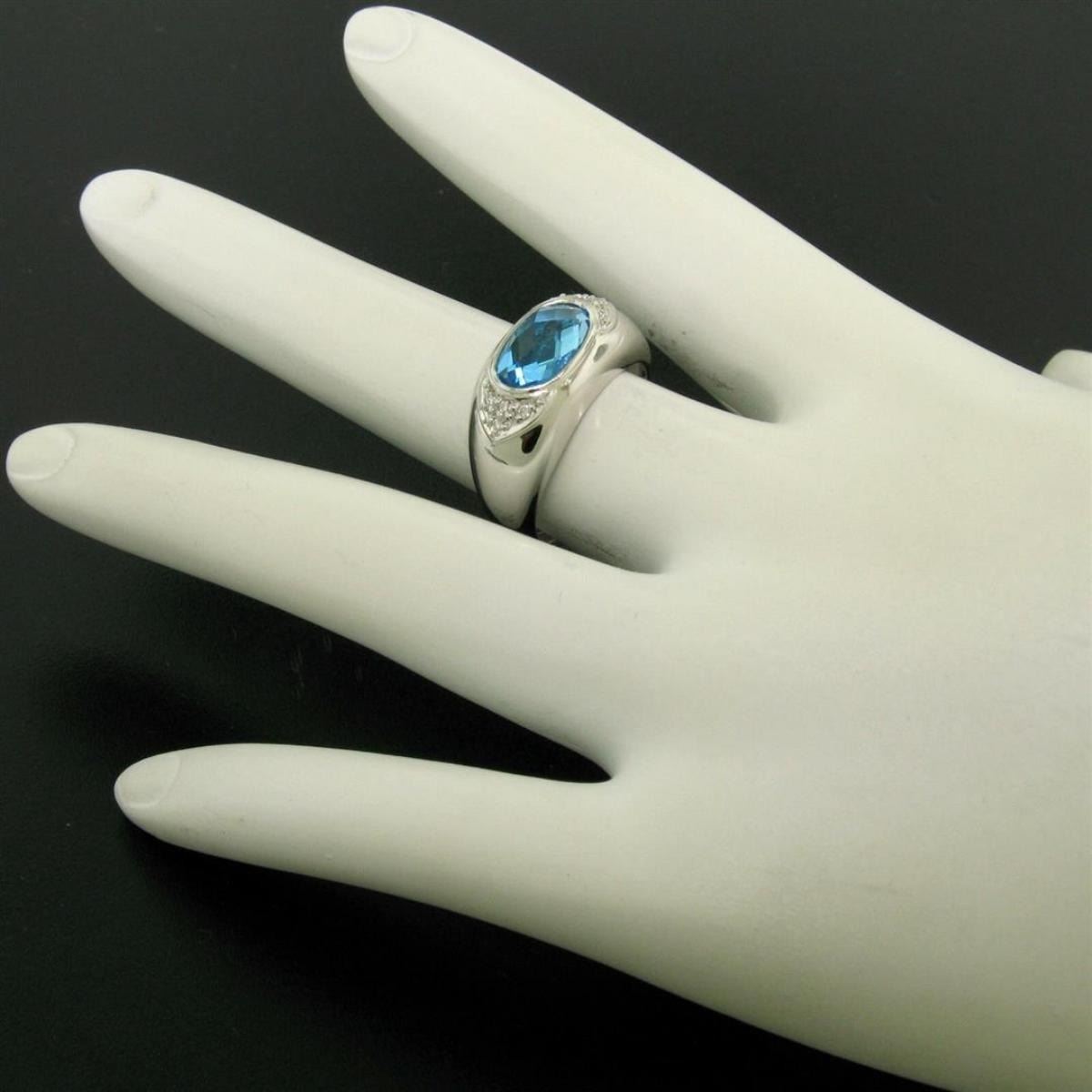 One 14K White Gold Oval Checkerboard Cut Bezel Blue Topaz Solitaire & Diamond Ring. Item Details - Material: 14K Solid White Gold, Weight: 4.3 Grams, Stone(s): (1) Natural Genuine Topaz - Pointed Oval Checkerboard Cut - Bezel Set - Rich Blue Color - 2.40ct (exact), (8) Natural Genuine Diamonds - Round Brilliant Cut - Pav� Set - F Color - SI1 Clarity - 0.08ctw (approx.), Total Carat Weight: 2.48 (approx.), Ring Size: 6.0, Ring Width: 9.5mm, Ring Height: 7mm rise off the finger, Signature: 14K 2.40, Condition: Like New!