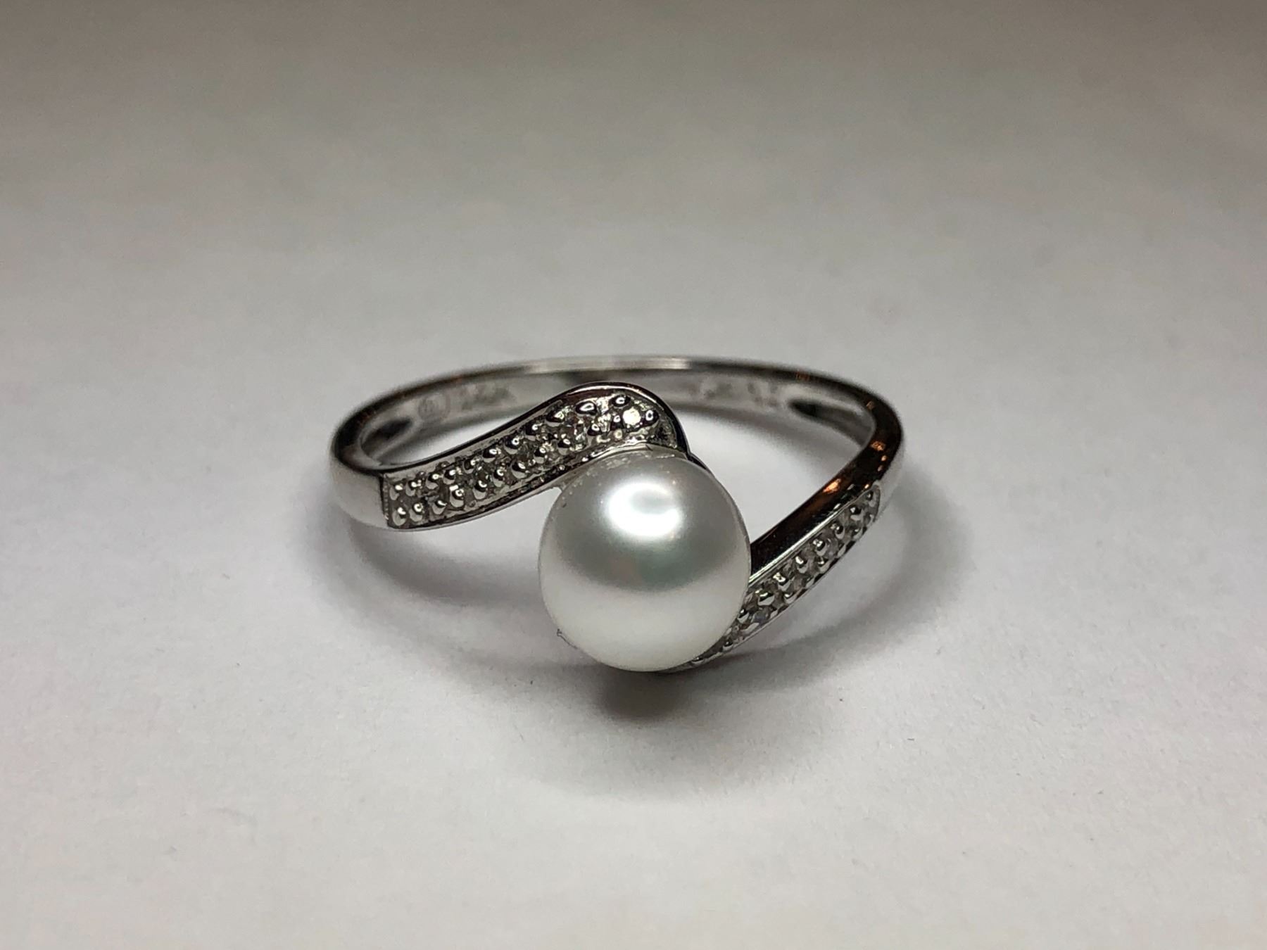 14K White Gold Pearl and Diamond Ring Weight: 1.9g 14K White Gold Centre Stone: White Cultured Pearl Side Stones: 0.05cttw Melee Diamonds Current Size: 7