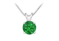 A round prong-set natural emerald with total gem weight (TGW) of 0.25 carat is delicately attached to a V shape 14K white gold. This gemstone solitaire pendant give a glamour look.