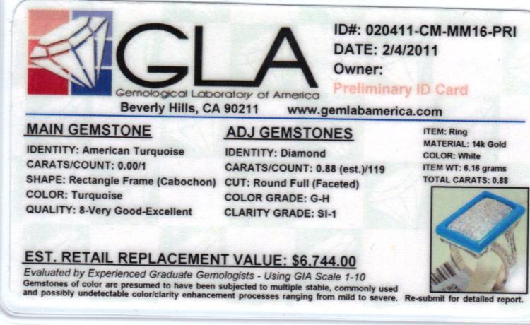 Total Weight of 119 Round Diamonds - 0.88 ct 1 Turquoise 14K White Gold - 6.16 grams Ring Size: 7
