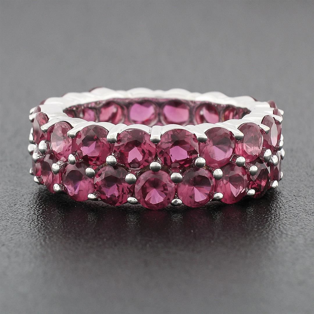 A solid 14k white gold eternity band ring, with 36 round brilliant cut red stones (3.6mm each). The ring is size 6.0, weighs a total of 7.42 grams, and measures 7.1mm wide.