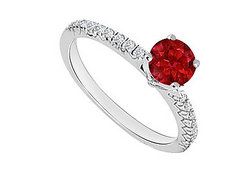 A stunning engagement ring with a large red ruby is prong-setting atop in the center & is accented by smaller round diamonds. Made in 14K white gold & has a total gem weight (TGW) of 0.75 carat and also available matching complete sets of engagement ring with wedding band model no.JS188ABW14DR and a single wedding band model no.W188BW14D