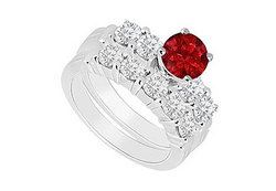 These matching engagement ring & wedding band sets features a round ruby in the center & is flanked by two prong-set diamonds on each side together with matching diamond wedding band . Made in polished 14K white gold & has a total gem weight (TGW) of engagement ring 0.90 carat and wedding band 0.50 carat. It also available with seperate engagement ring model no.JS661AW14DR & wedding band model no.W661ABW14D.