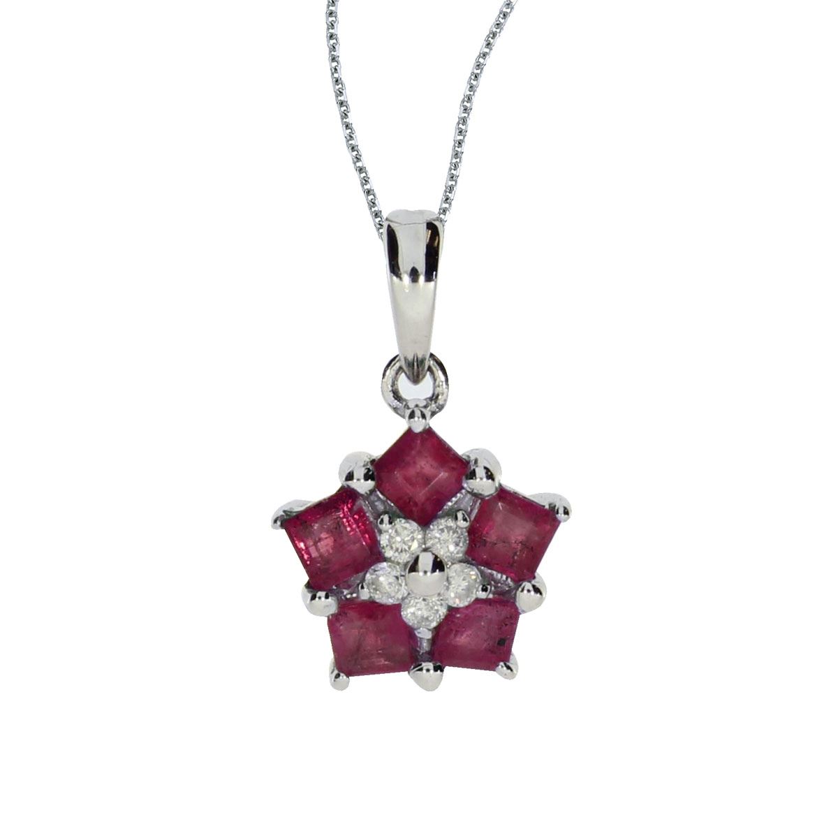 This pendant contains five square rubies in an elegent star shape surrounding .10 total carats of diamonds. Includes 18" chain.