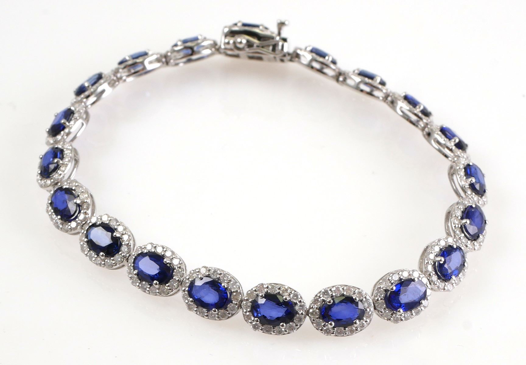 14K white gold with (20) oval mixed cut sapphires approx. 10.69 ct. and (260) prong set round brilliant cut diamonds approx. 2.92 ct. Bracelet measures 7" in length with twin safety clasp. Comes with retail appraisal for $12,400. Excellent condition, see photos for more details on condition.