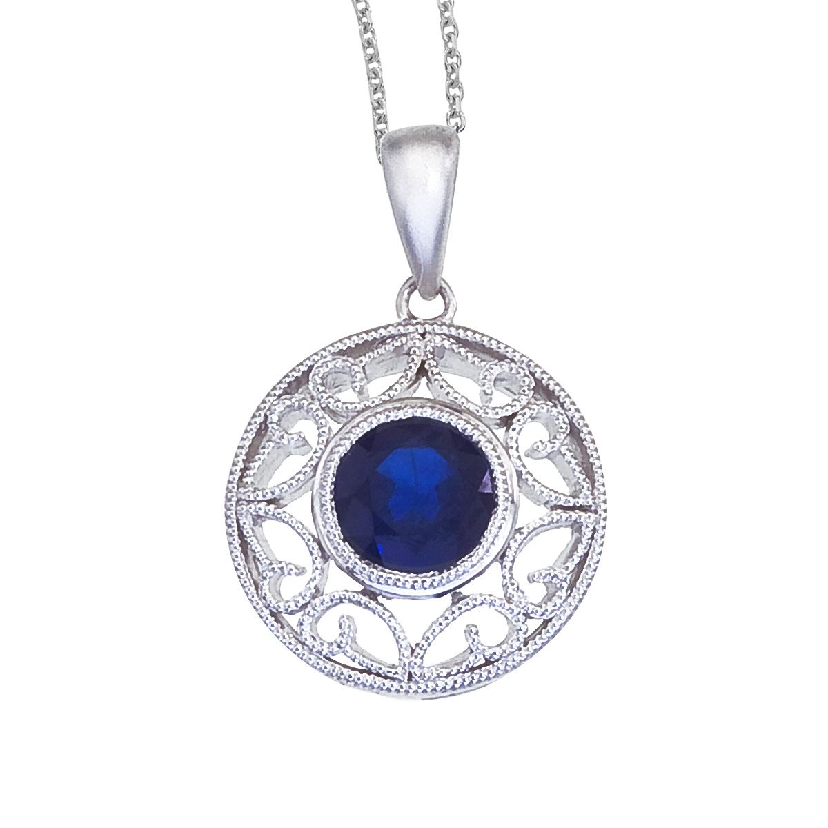 A 6mm bezel set round sapphire set within a beautiful 14k white gold filigree design. Includes 18" chain.