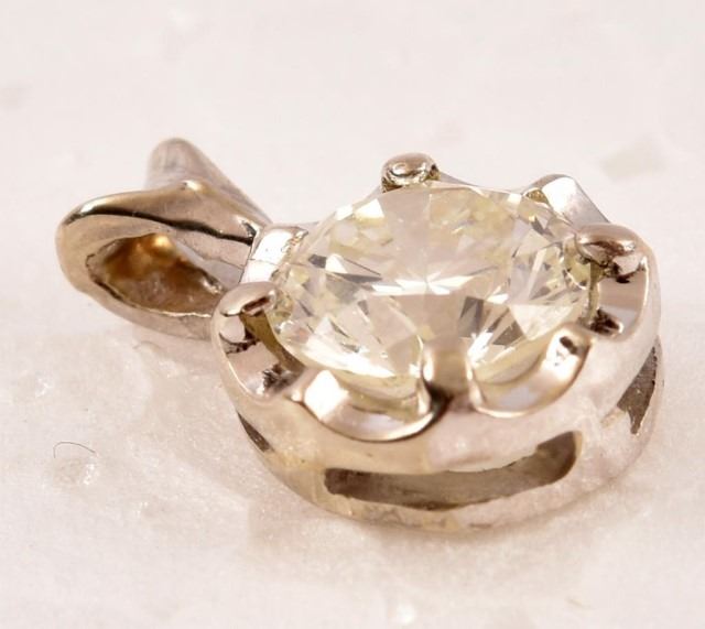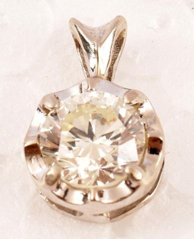 This pendant contains one approximately .79ct. (VVS1/1) round brilliant cut diamond. The diamond is set in a scalloped four prong mounting, The pendant measures approximately 7.6mm round. The total gold weight is .6