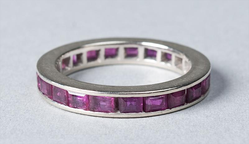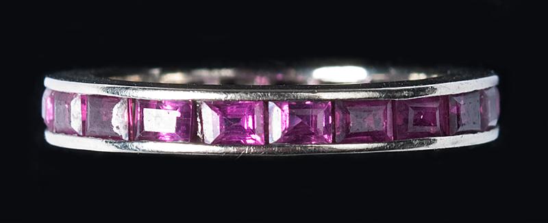 Size 6.25. Channel set with 21 rectangular step-cut natural rubies 3.0 cts. 4 grams total weight. Replacement value $1500, appraisal on file.