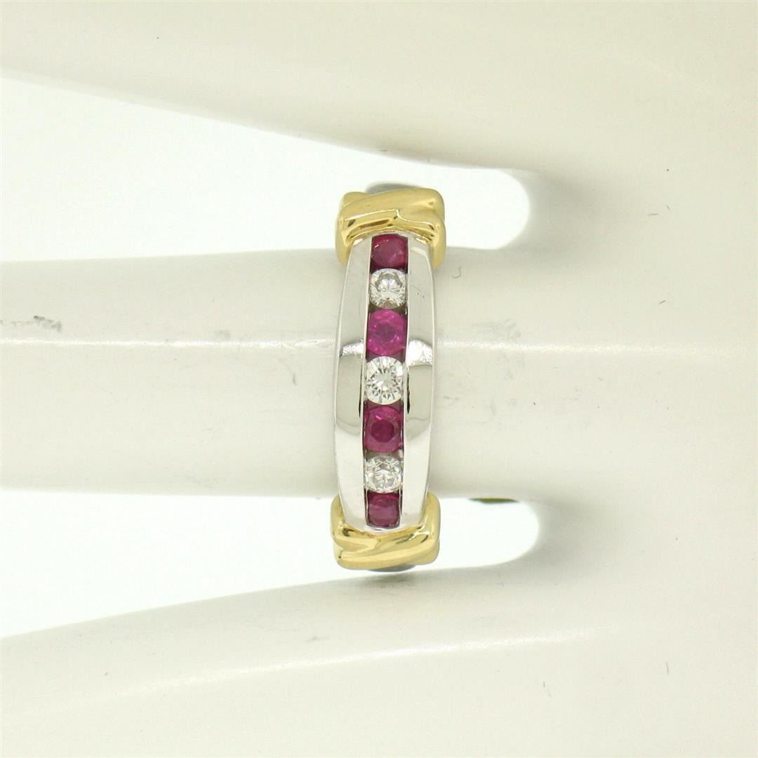 One 14K White & Yellow Gold 0.47ctw Top Quality Diamond & Ruby Channel Set Band Ring. Item Details: Material: 14K Solid White & Yellow Gold, Weight: 4.5 Grams, Stone(s): (3) Natural Genuine Diamonds - Round Brilliant Cut - Channel Set - F/G Color - VS1 Clarity - 0.15ctw (approx.), (4) Natural Genuine Rubies - Round Brilliant Cut - Channel Set - Rich Blood Red Color - 0.32ctw (approx.), Total Carat Weight: 0.47 (approx.), Ring Size: 7.0, Ring Width: 5.5mm (at the center) - 5.9mm (at the X designs), Ring Height: 3.3mm rise off the finger, Signature: 14K THL © Condition: Like New!