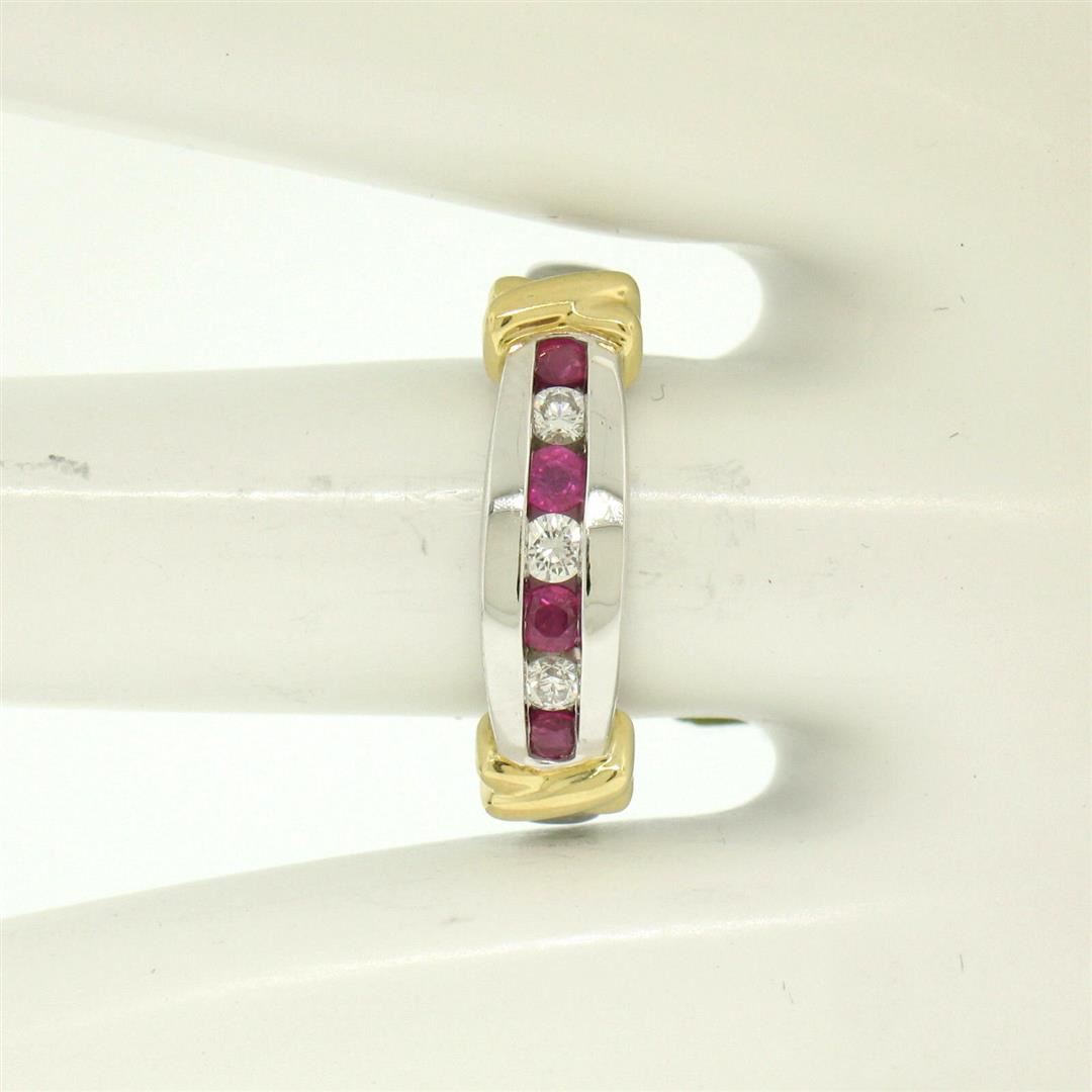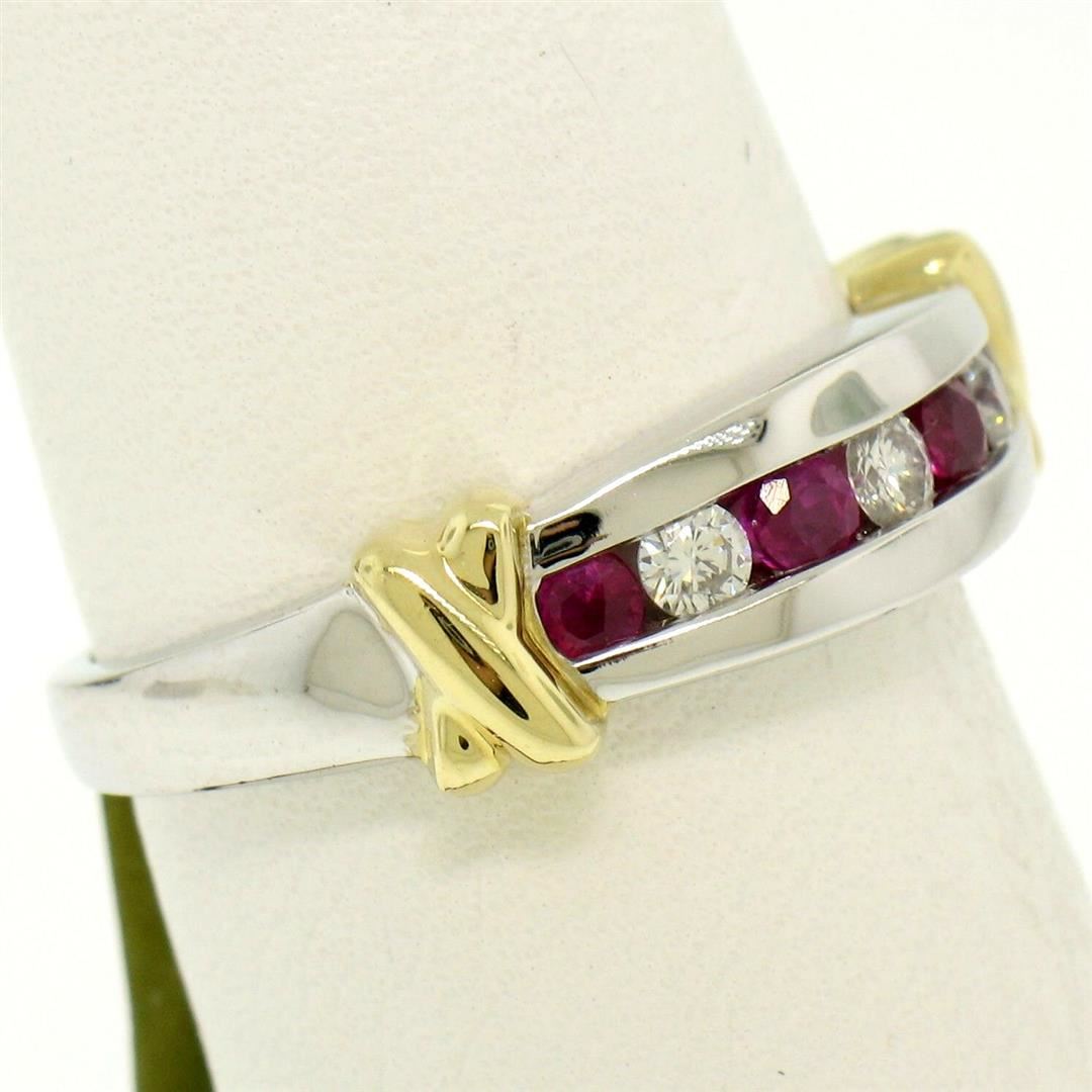 One 14K White & Yellow Gold 0.47ctw Top Quality Diamond & Ruby Channel Set Band Ring. Item Details: Material: 14K Solid White & Yellow Gold, Weight: 4.5 Grams, Stone(s): (3) Natural Genuine Diamonds - Round Brilliant Cut - Channel Set - F/G Color - VS1 Clarity - 0.15ctw (approx.), (4) Natural Genuine Rubies - Round Brilliant Cut - Channel Set - Rich Blood Red Color - 0.32ctw (approx.), Total Carat Weight: 0.47 (approx.), Ring Size: 7.0, Ring Width: 5.5mm (at the center) - 5.9mm (at the X designs), Ring Height: 3.3mm rise off the finger, Signature: 14K THL © Condition: Like New!