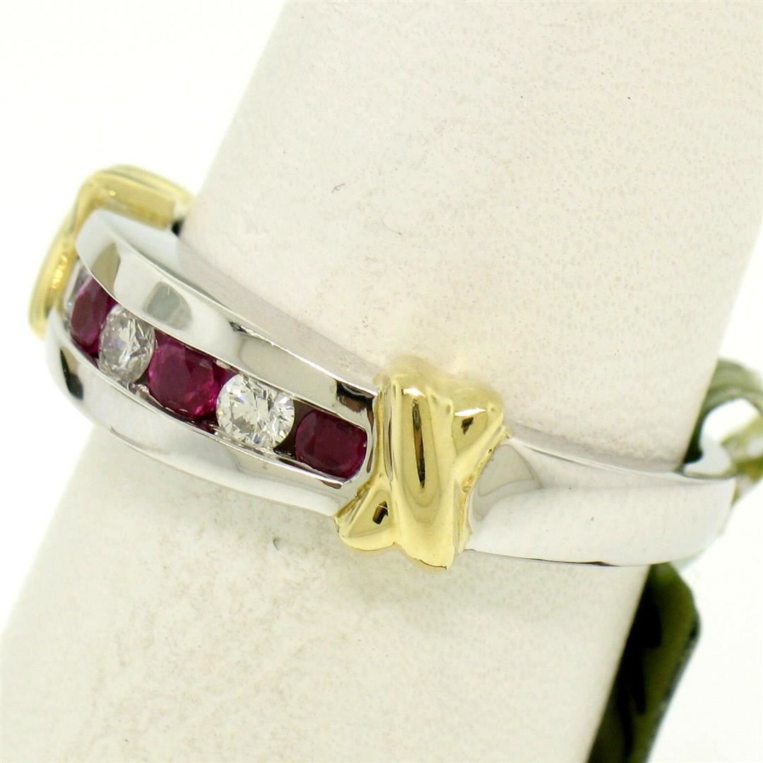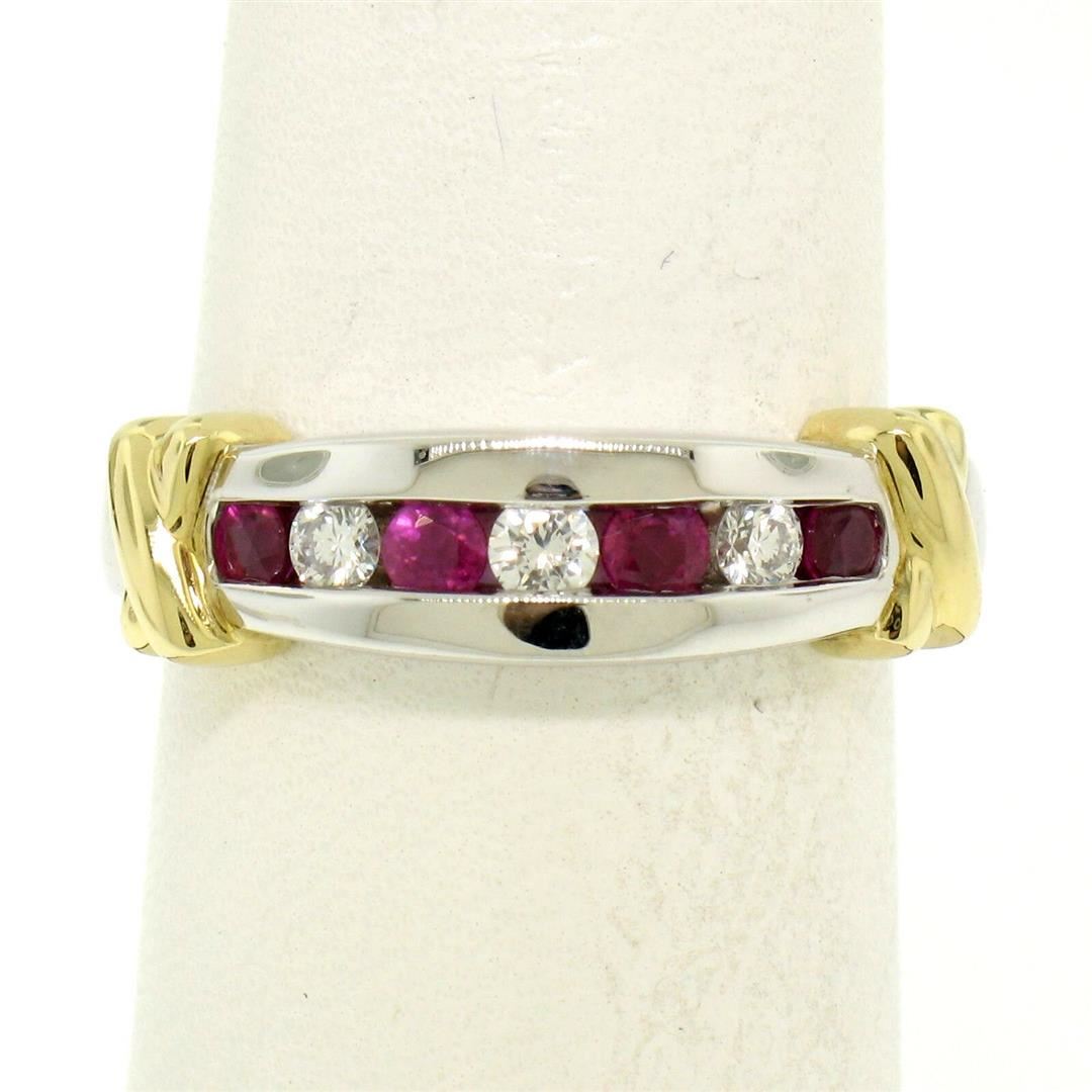 One 14K White & Yellow Gold 0.47ctw Top Quality Diamond & Ruby Channel Set Band Ring. Item Details: Material: 14K Solid White & Yellow Gold, Weight: 4.5 Grams, Stone(s): (3) Natural Genuine Diamonds - Round Brilliant Cut - Channel Set - F/G Color - VS1 Clarity - 0.15ctw (approx.), (4) Natural Genuine Rubies - Round Brilliant Cut - Channel Set - Rich Blood Red Color - 0.32ctw (approx.), Total Carat Weight: 0.47 (approx.), Ring Size: 7.0, Ring Width: 5.5mm (at the center) - 5.9mm (at the X designs), Ring Height: 3.3mm rise off the finger, Signature: 14K THL © Condition: Like New!