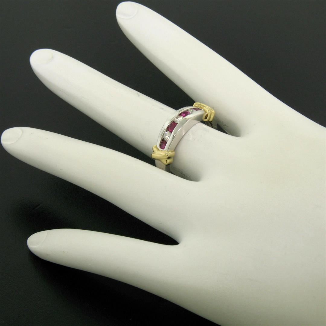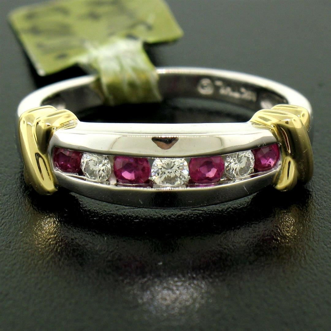 One 14K White & Yellow Gold 0.47ctw Top Quality Diamond & Ruby Channel Set Band Ring. Item Details: Material: 14K Solid White & Yellow Gold, Weight: 4.5 Grams, Stone(s): (3) Natural Genuine Diamonds - Round Brilliant Cut - Channel Set - F/G Color - VS1 Clarity - 0.15ctw (approx.), (4) Natural Genuine Rubies - Round Brilliant Cut - Channel Set - Rich Blood Red Color - 0.32ctw (approx.), Total Carat Weight: 0.47 (approx.), Ring Size: 7.0, Ring Width: 5.5mm (at the center) - 5.9mm (at the X designs), Ring Height: 3.3mm rise off the finger, Signature: 14K THL © Condition: Like New!
