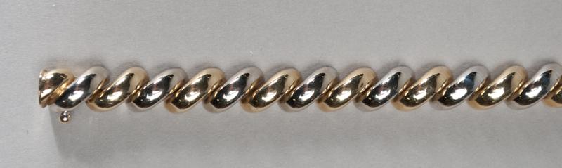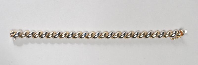 Alternating curves of white and yellow gold, 7" L. 12 grams total weight.