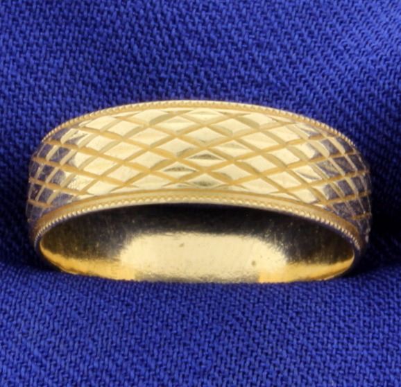 This ring is 14 yellow gold and is 5.8mm wide with a beautiful design. Size 8 3.6g