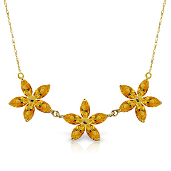 A 14 karat Solid Gold Necklace captures three flowers in full bloom. Petals are lavishly accented with Natural Citrines.