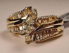 14K YELLOW AND WHITE GOLD DIAMOND LADIES ENGAGEMENT RING SET - SIZE 6.5 - Comes with GLA Appraisal of $2,274.00. 1 Marquee Cut Diamond Center Stone. 2 Marquee Cut Adjacent Diamonds. 29 Baguette Cut Diamonds. Diamonds - 0.81 CT., TW - 6.0 Grams