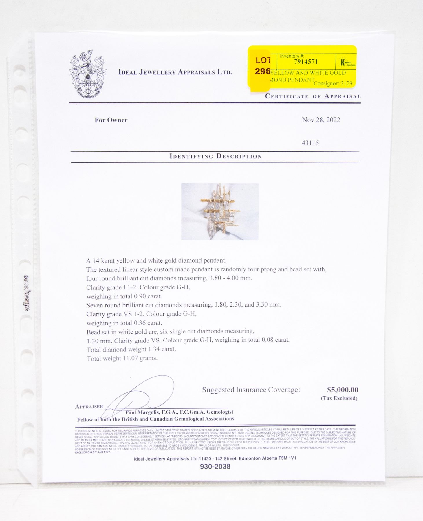 THE TEXTURED LINEAR STYLE CUSTOM MADE PENDANT IS RANDOMLY FOUR PRONG AND BEAD SET WITH FOUR ROUND BRILLIANT CUT DIAMONDS MEASURING 3.80-4.00 mm CLARITY GRADE I 1-2 COLOR GRADE G-H. WEIGHING IN TOTAL 0.90 CARAT. SEVEN ROUND BRILLIANT CUT DIAMONDS MEASURING 1.80, 2.30, AND 3.30mm. CLARITY GRADE VS 1-2 COLOR GRADE G-H. WEIGHING IN TOTAL 0.36 CARAT. BEAD SET IN WHITE GOLD ARE SIX SINGLE CUT DIAMONDS MEASURING 1.30 mm CLARITY GRADE VS. COLOR GRADE G-H. WEIGHING IN TOTAL 0.08 CARAT, TOTAL DIAMOND WEIGHT 1.34 CARAT. TOTAL WEIGHT IS 11.07 GRAMS. COMES WITH CERTIFICATE OF APPRAISAL, APPRAISED AT $5,000.00. **ALL ITEMS MUST BE REMOVED BY 5PM SATURDAY, DECEMBER 10TH 2022. ALL REMAINING ITEMS WILL BE SUBJECT TO A $6.00 PER DAY STORAGE CHARGE. ANY ITEMS REMAINING AFTER MONDAY, DECEMBER 25TH, 2022 WILL BE CONSIDERED FORFEITED. NO REFUNDS WILL BE ISSUED FOR FORFEITED ITEMS. TO SCHEDULE A PICK UP APPOINTMENT CLICK HERE