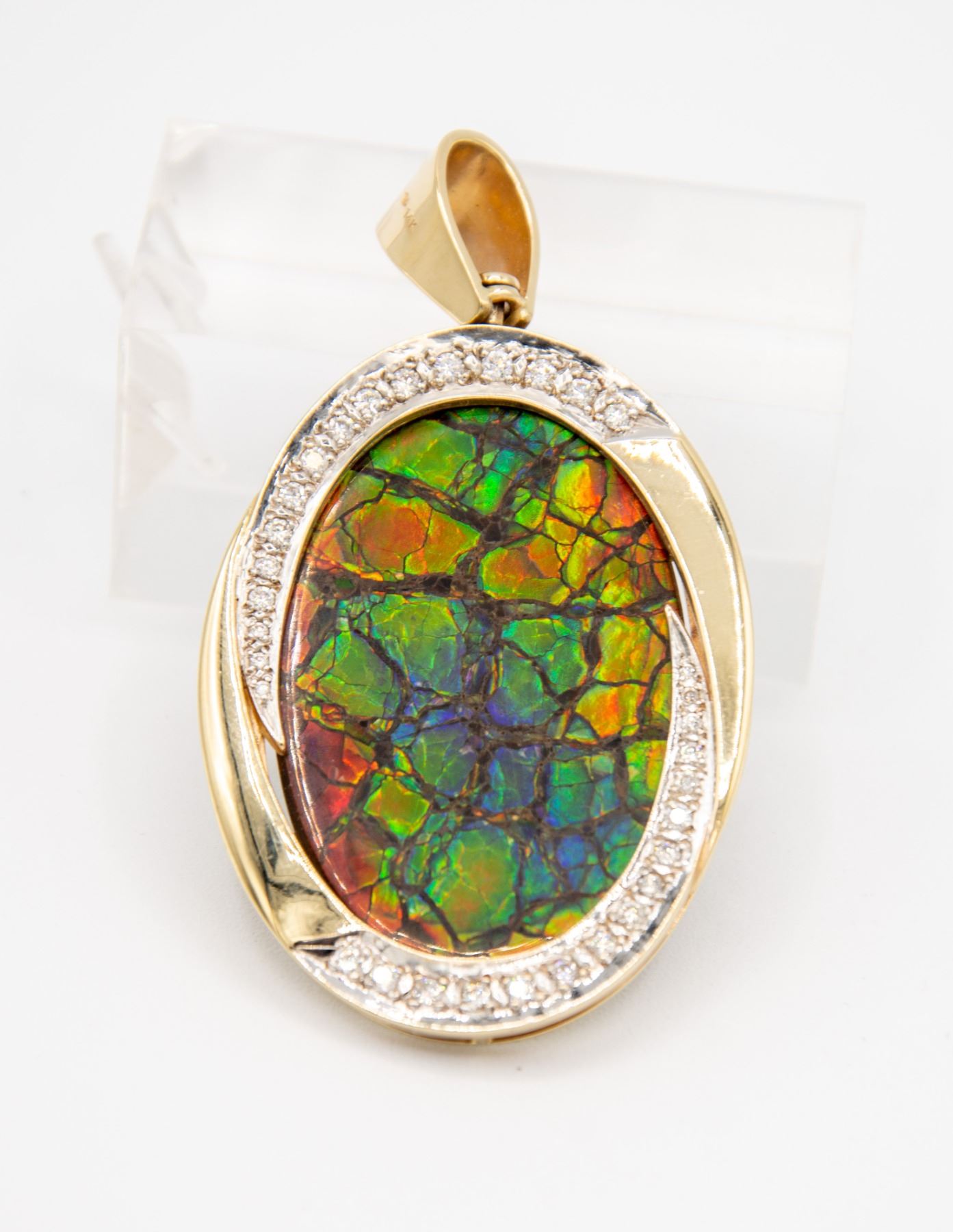THE CUSTOM MADE TWO TONE, DOUBLE SIDED PENDANT IS REVERSE SET WITH, AN OVAL SHAPED UNCAPPED,ALL NACRE AMMOLITE MEASURING APPROXIMATELY, 40.00 - 28.00 MM.,GRADE AA WITH A FULL SPECTRUM OF COLOURS.THE REVERSE SIDE IS PREDOMINANTLY BLUE AND GREEN.THE TWO TONE RIBBON STYLE MOUNT IS BEAD SET WITH,32 ROUND BRILLIANT CUT DIAMONDS MEASURING, 1.10 - 1.90 AND 2.20 MM.CLARITY GRADE SI 1-2. COLOUR GRADE G-H.TOTAL DIAMOND WEIGHT 1.00 CARAT.TOTAL WEIGHT 27.16 GRAMS.