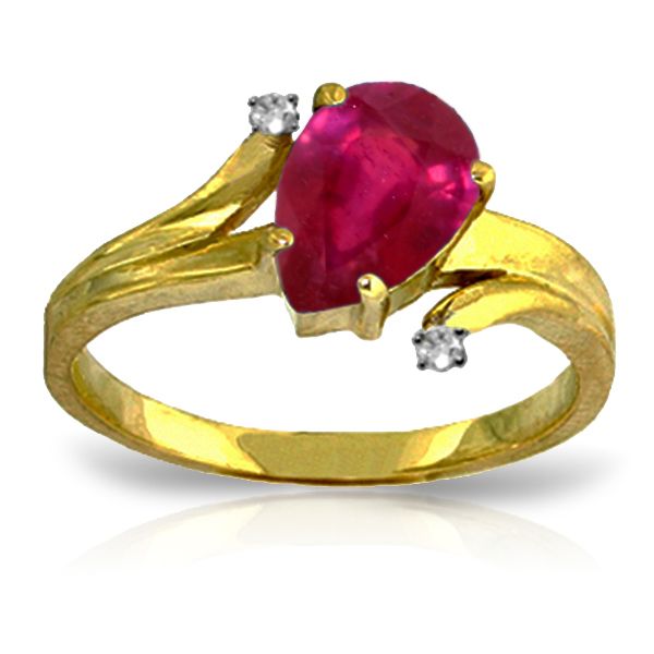 A treatment colors Natural pear shaped Ruby is embraced in this 14 karat Ring while being protected by two Genuine Diamonds. This gemstone ring will surely be treasured for life.